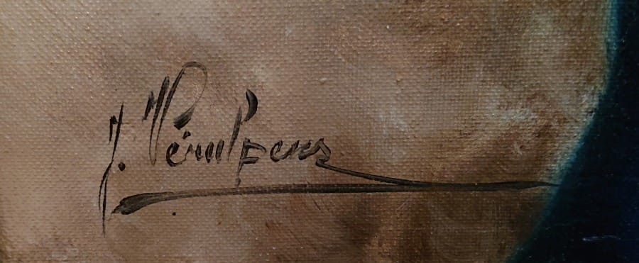 Malarz umieścił na obrazie swój podpis w lewym dolnym narożniku. Obraz oprawiony w stylową, oryginalną ramę w kolorze złota.