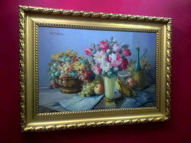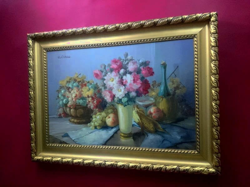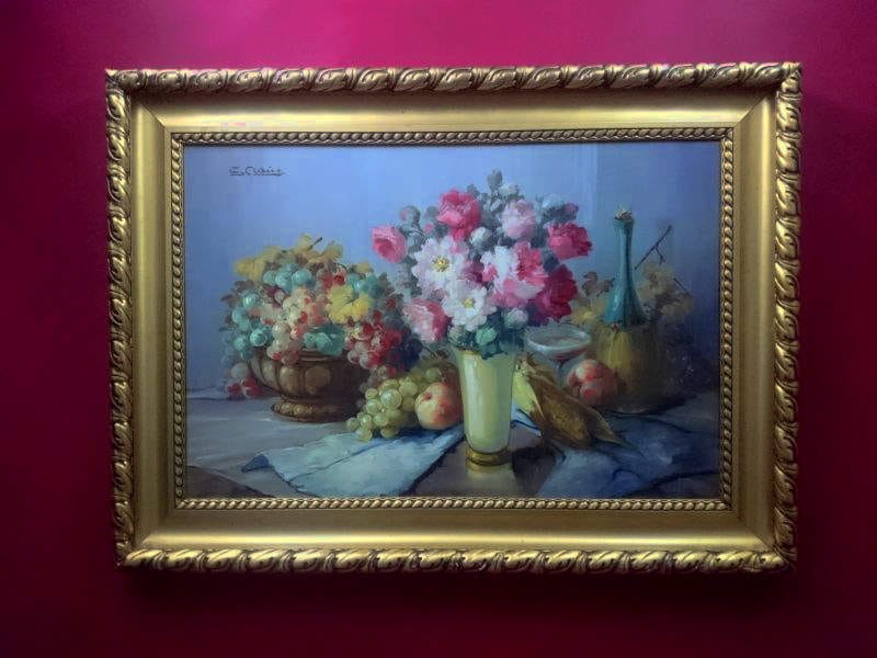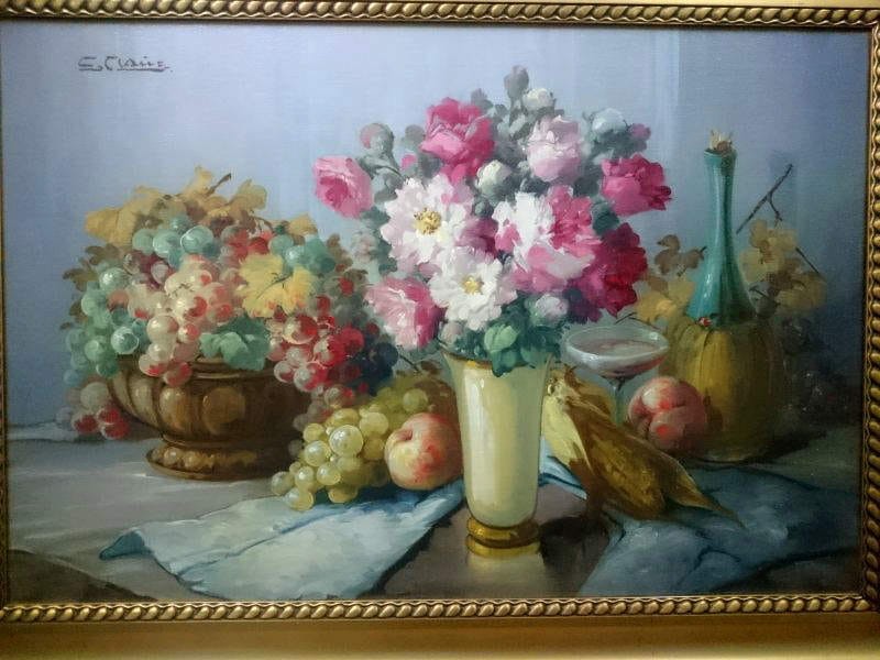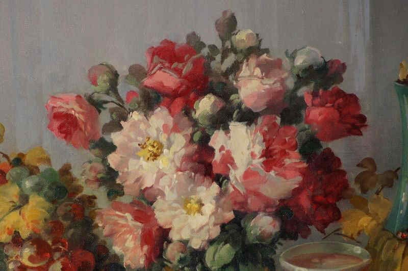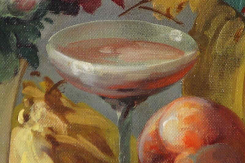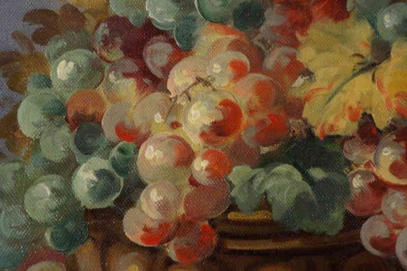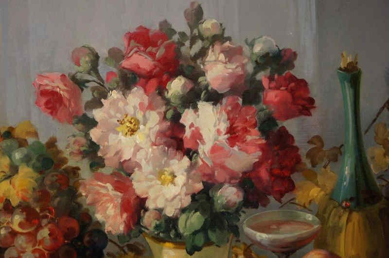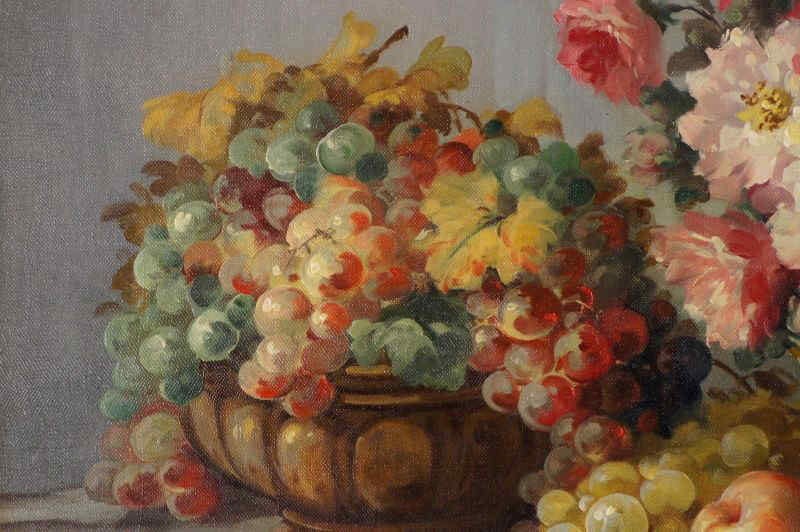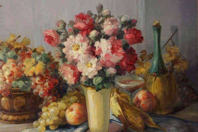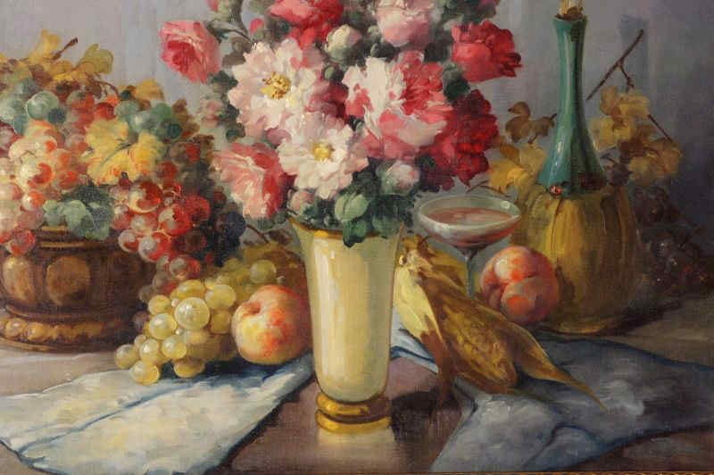 Oryginalny duży, perfekcyjnie malowany obraz olejny na płótnie, przedstawiający martwą naturę. Autorem tej pracy pochodzącej z lat 20, 20 wieku jest Georg CLAUS. Struktura nałożonej farby wyczuwalna jest pod palcami. Sygnowany lewa góra : G.Claus. Całość oprawiona w oryginalną, okazałą, przestrzenną ramę. Dzieło polecamy koneserom cennego i dobrego malarstwa. Obraz do powieszenia na ścianie.Stan zachowania: bardzo dobry. Wymiary: całości z ramą 98 cm x 71 cm, płótno 80 cm x 54 cm.