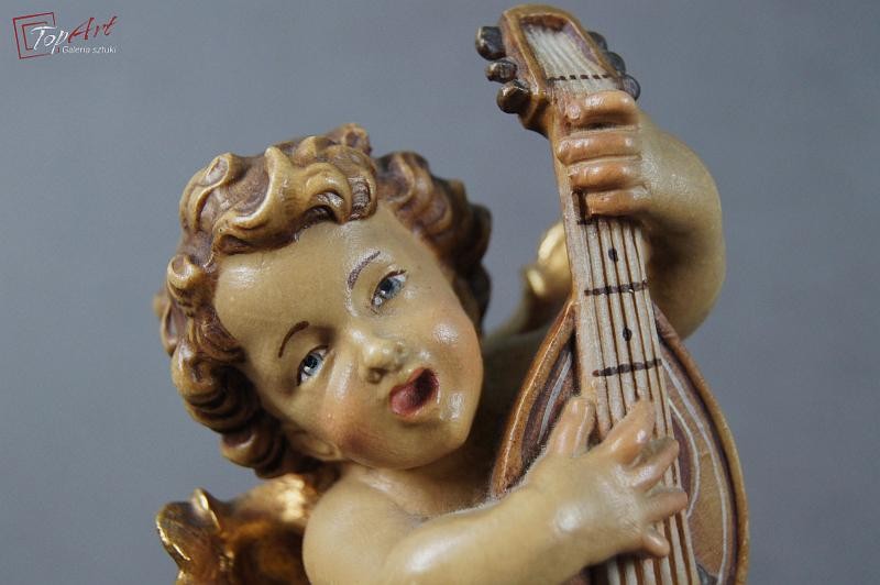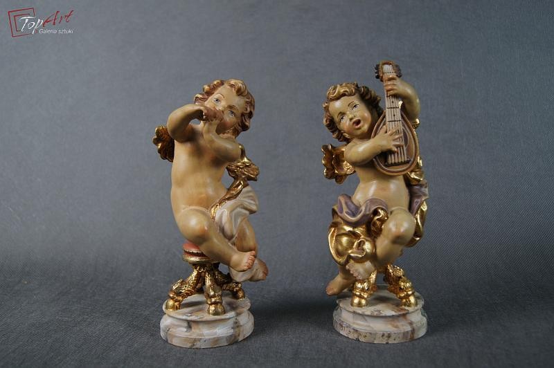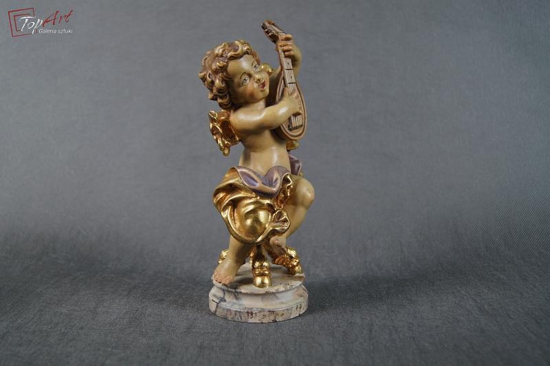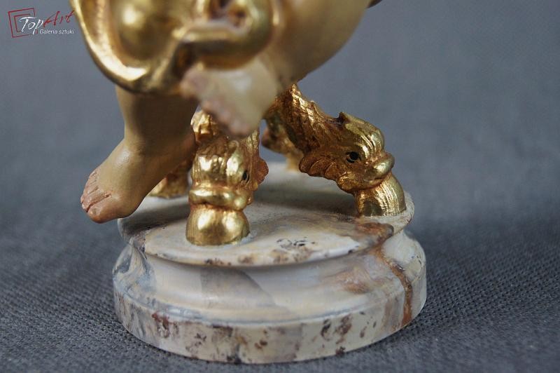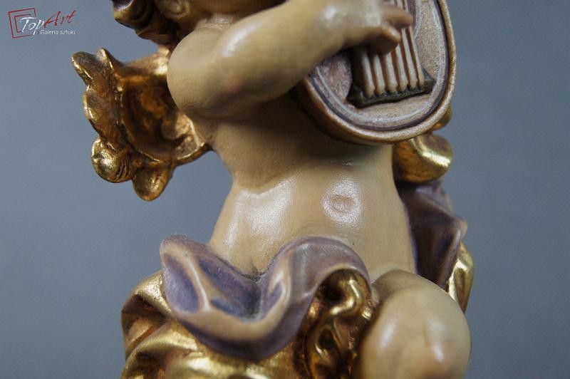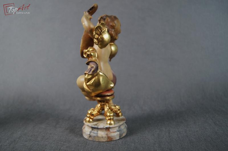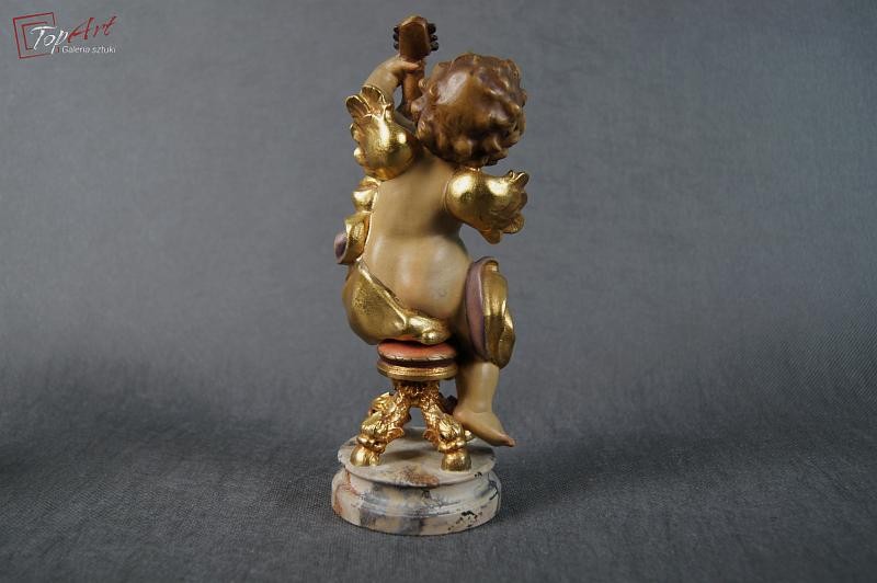 Prześliczny siedzący amorek. Przedmiot ręcznie wyrzeźbiony w drewnie. Pochodzi z Włoch. Wykonany w latach 70 - 80 XX wieku.Wykonany w polichromii złocony. Stan zachowania - bardzo dobry. Wymiary: wysokość 21 cm, średnica podstawy 7,5 cm.