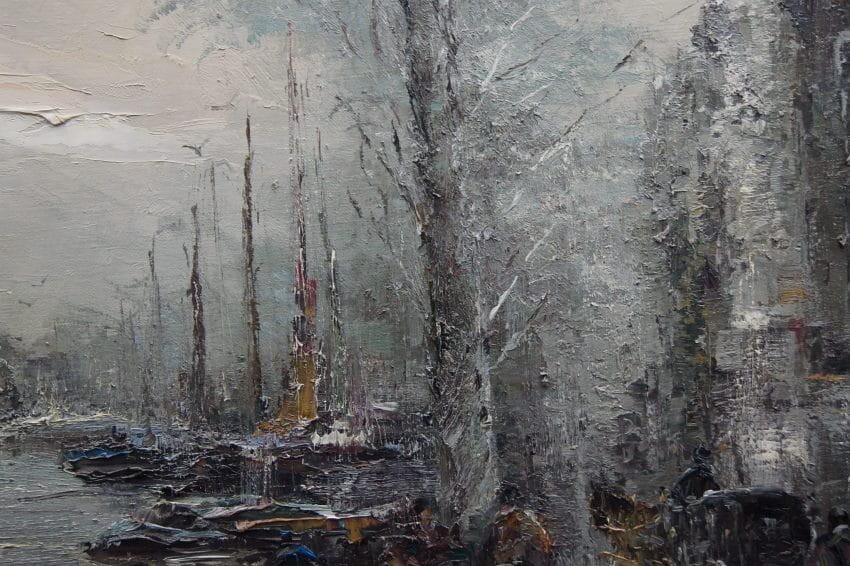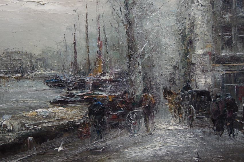 Praca malowana w stylu impresjonistycznym. Obraz olejny malowany na płótnie. Tworzony z ogromną perfekcją. Obraz przedstawia uroczą scenę z życia nad kanałem w Amsterdamie. Na pracy została uwidoczniona zabudowa, wiele postaci, przejeżdżające dorożki, oraz liczne jednostki pływające przycumowane do nadbrzeża.Autor notowany w Artprice i innych cenionych portalach aukcyjnych. Jego dzieła są bardzo pożądane na aukcjach dzieł sztuki. Sygnowany odręcznie przez artystę w prawym dolnym narożniku: J.Bevort. Obraz oprawiony jest w przepiękną, stara przestrzenną, bogatą ramę w kolorze złota. Dzieło polecamy koneserom cennego i dobrego malarstwa.