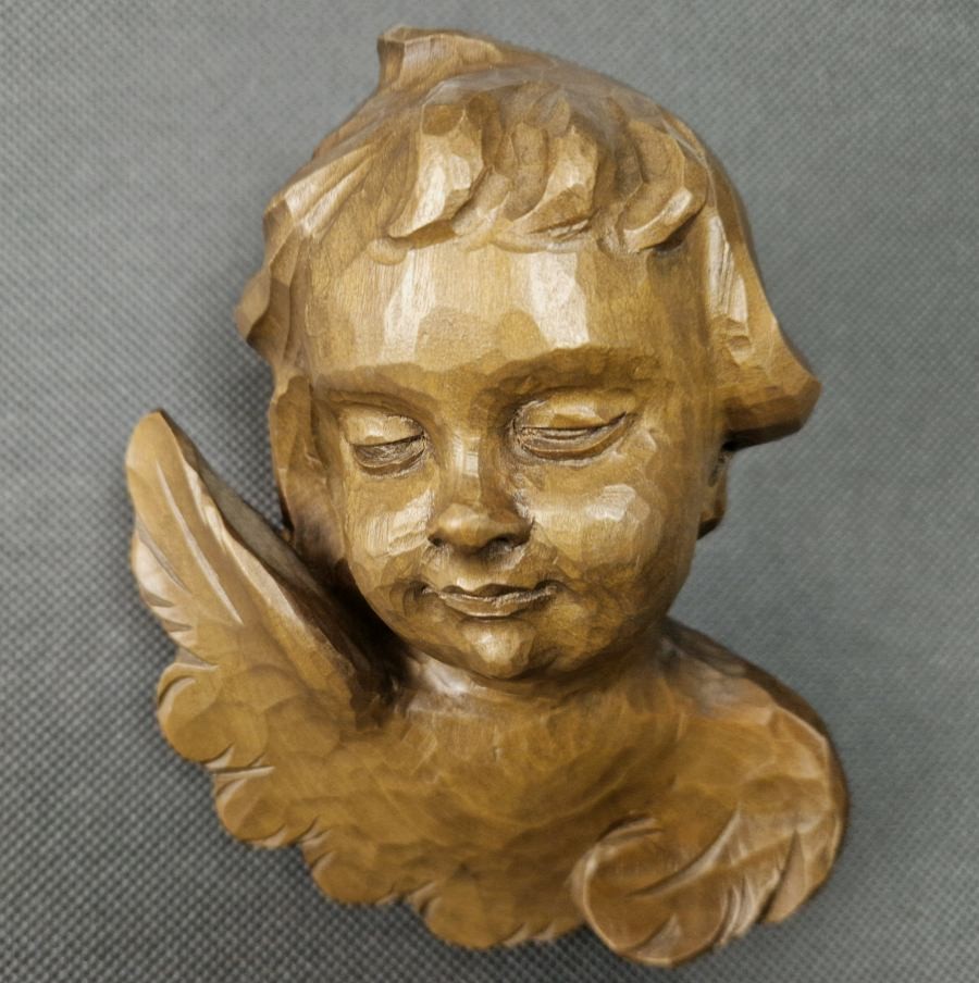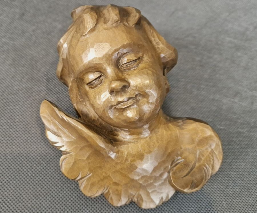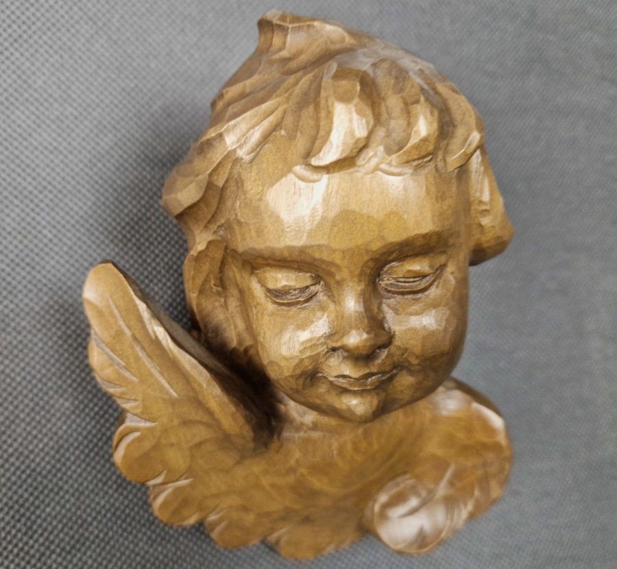 Amorek, aniołek, głowa wyrzeźbiona w drewnie, wykończone politurą i woskiem. Przedmioty ręcznie wyrzeźbione w drewnie, odzwierciedlający liczne szczegóły. Pochodzą z Tyrolu niemieckiego lub włoskiego. Wykonana w latach 60 - 70 XX wieku. Imponujący cherubinek do kolekcji.
