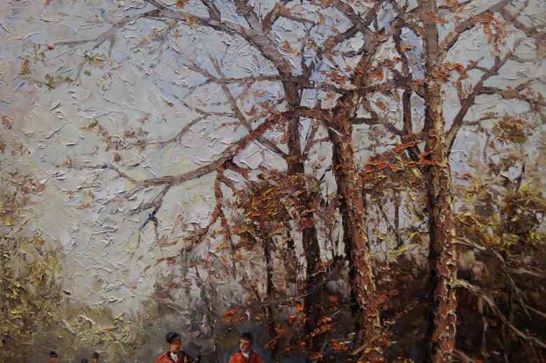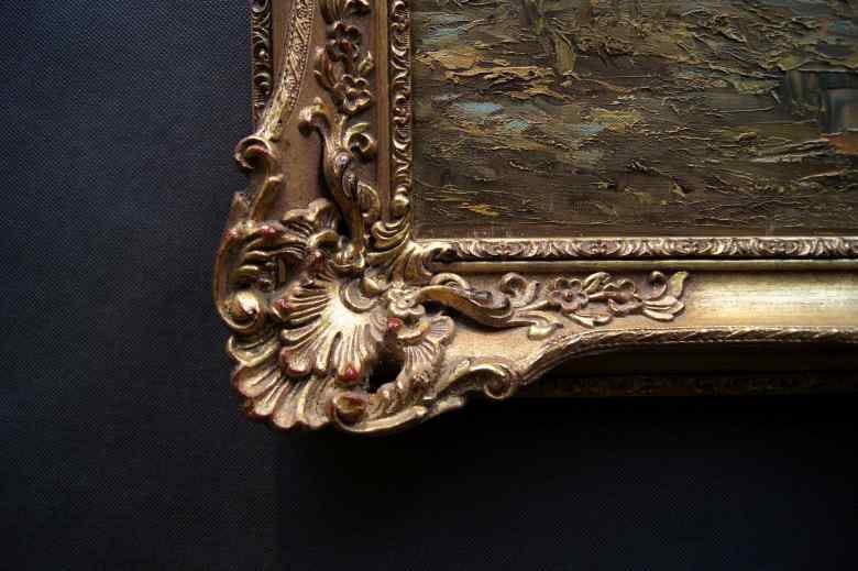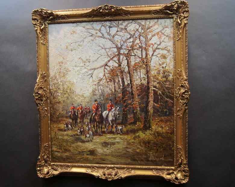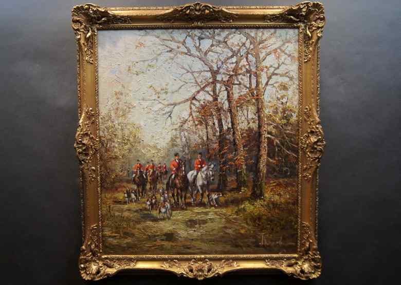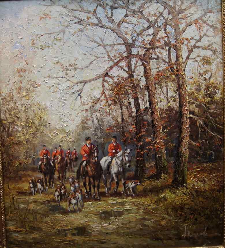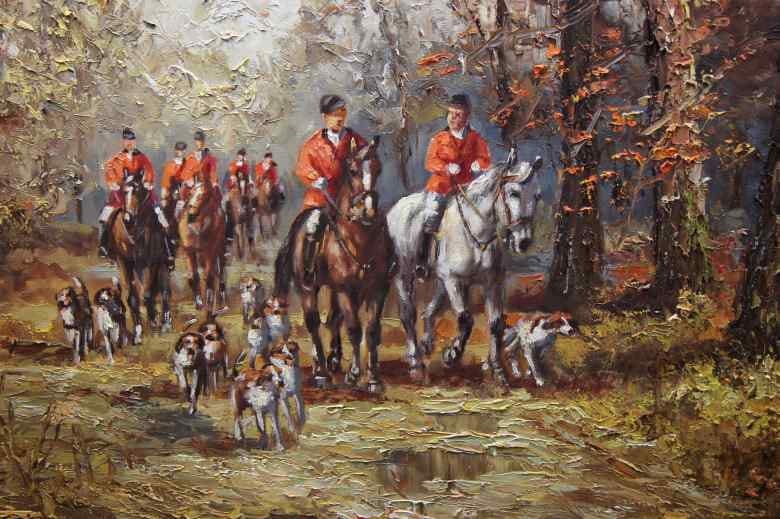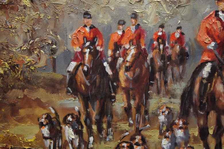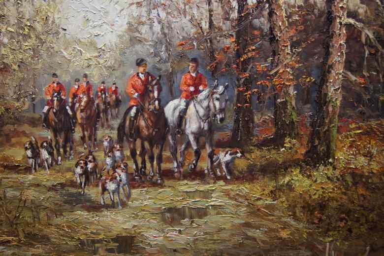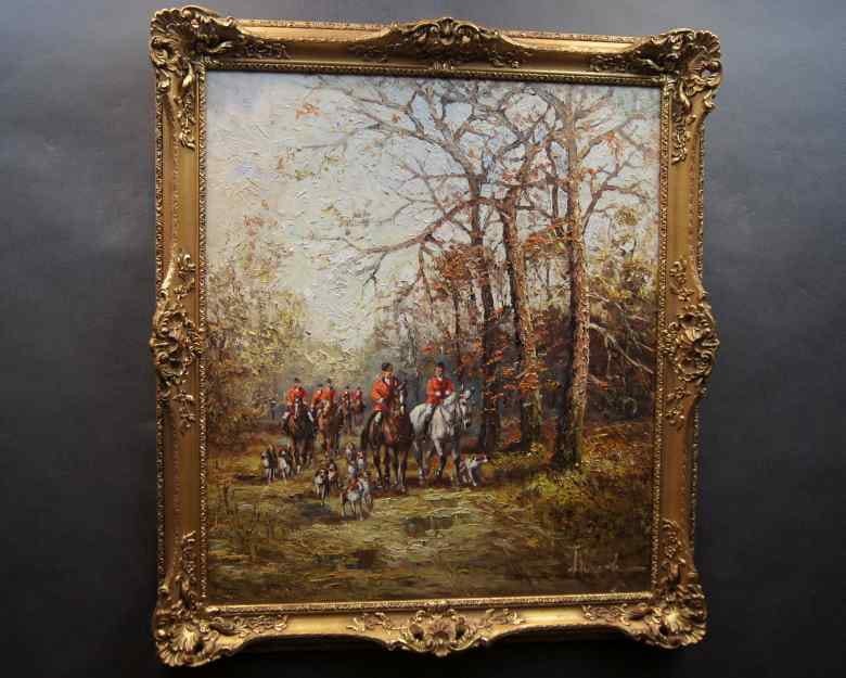 Bardzo dobra, perfekcyjnie wykonana praca olejna namalowana na płótnie, Niezwykle dekoracyjna prezentująca scenę wyjazdu na polowanie. Technika : szpachla. Obraz pochodzi z lat 60 - 70 XX wieku. Struktura nałożonej farby wyczuwalna jest pod palcami. Sygnowany przez twórcę prawy dół: A. Wendehals. Całość oprawiona w oryginalną przestrzenną złotą ramę. Dzieło polecamy osobom poszukującym dobre malarstwo dobrego malarstwa. Obraz do powieszenia na ścianie.