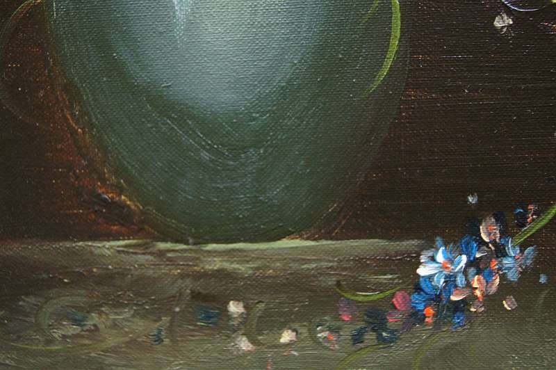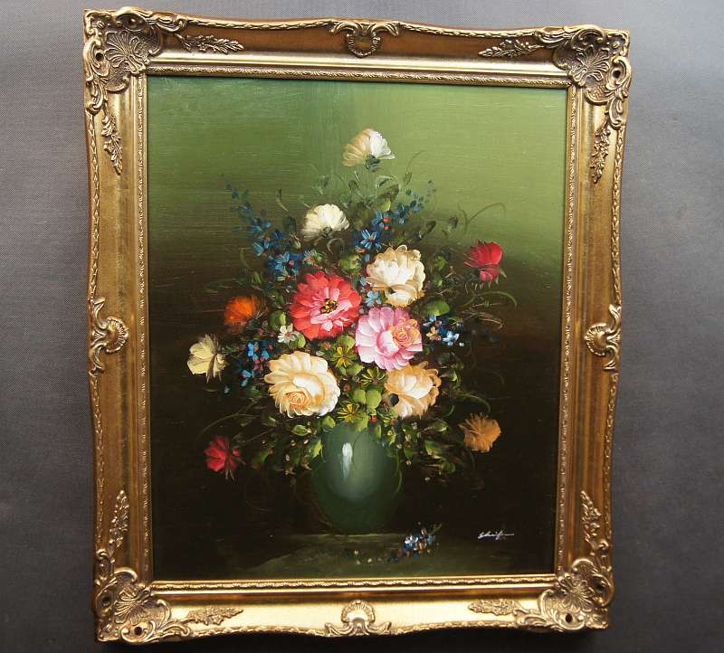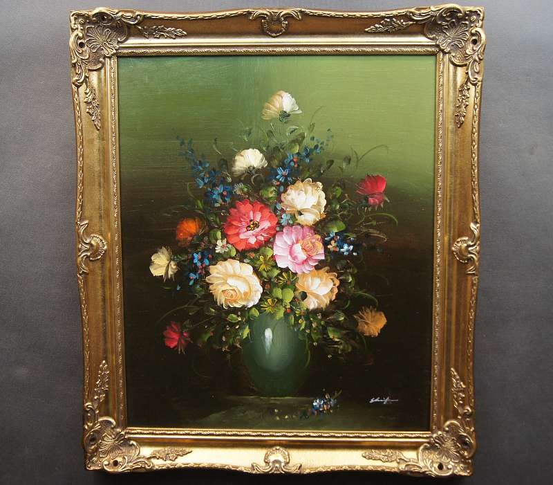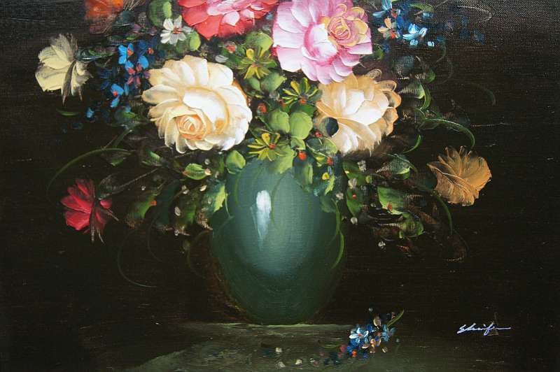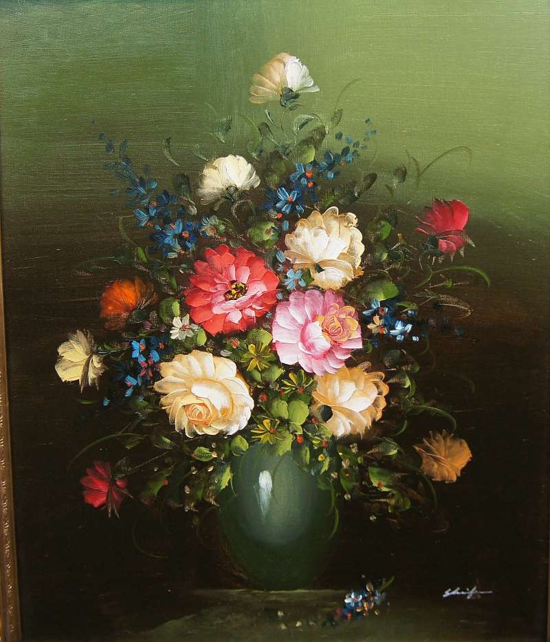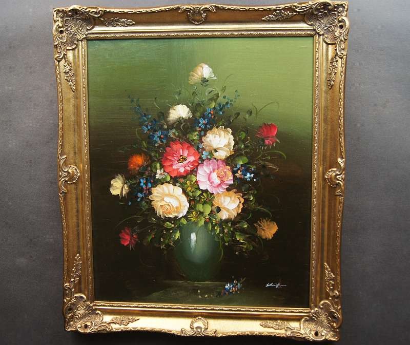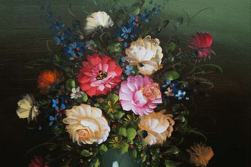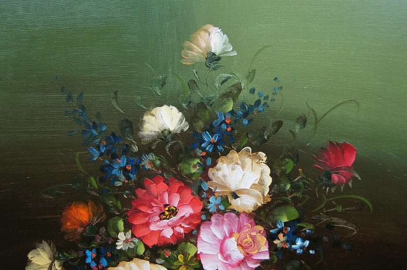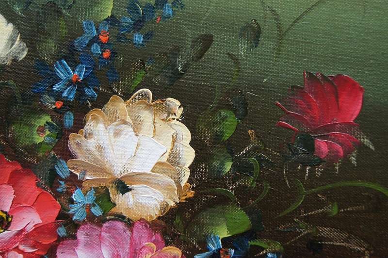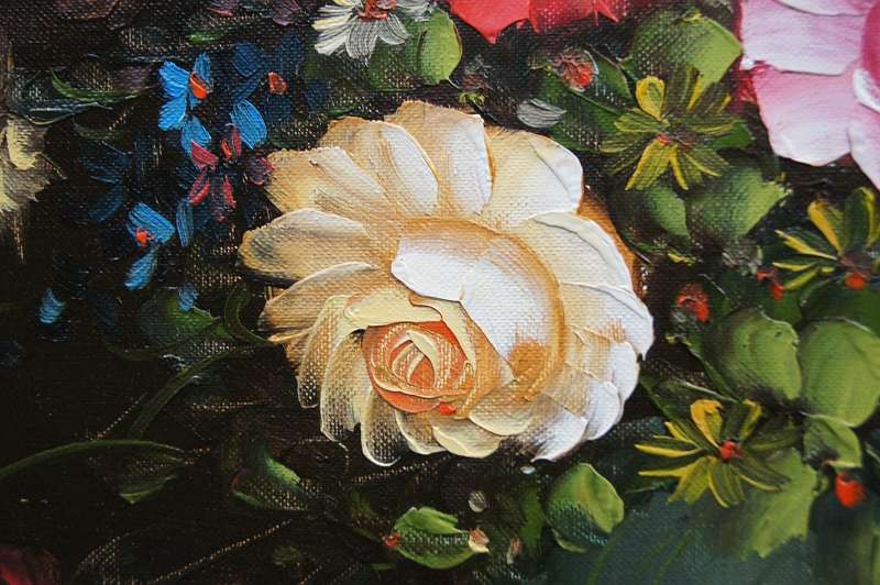 Obraz olejny przedstawiający niezwykle barwny bukiet róż. Obraz malowany farbami na płótnie. Sygnowany przez artystę prawy dół : ? .Pochodzenie obrazu to lata 90 XX wieku. Całość oprawiona w oryginalną ramę.
