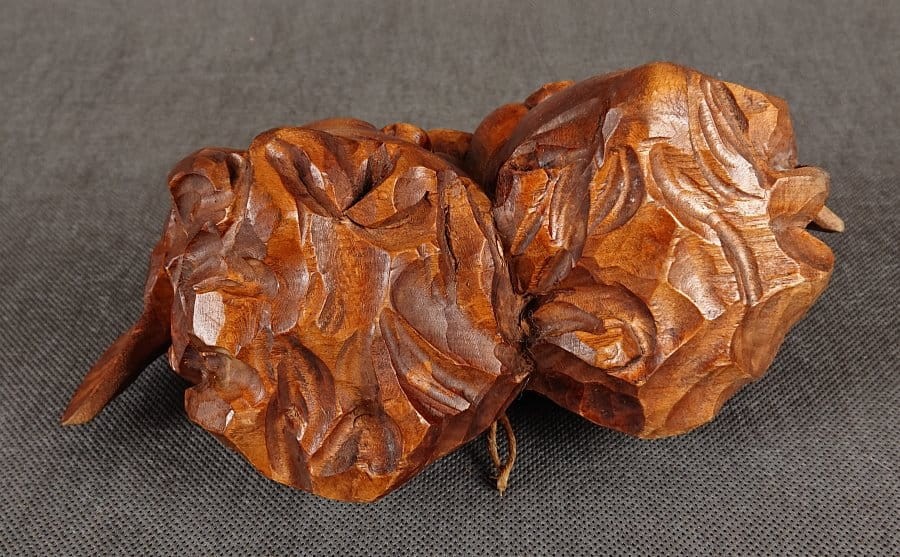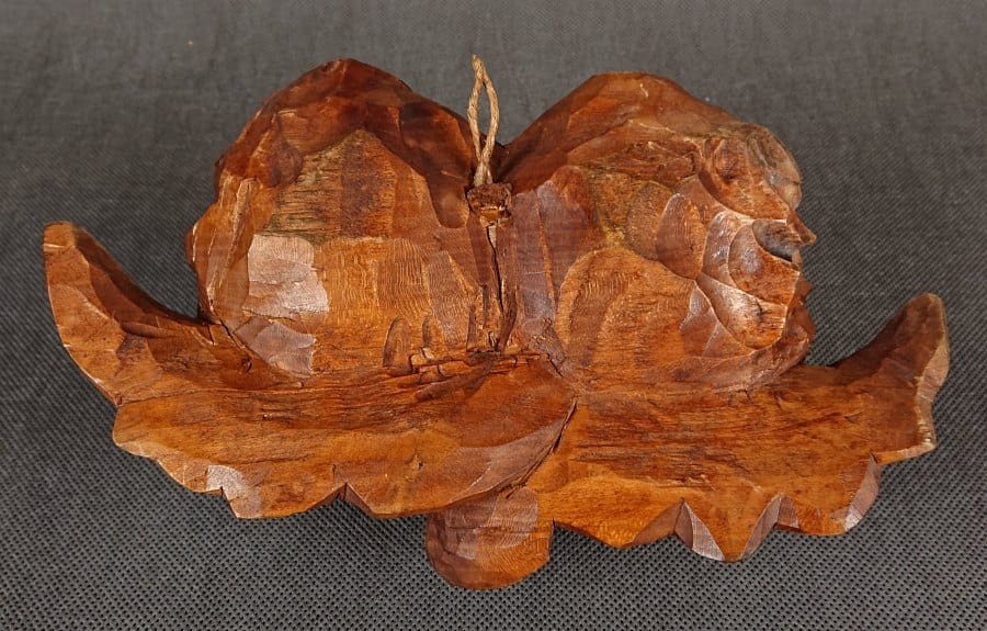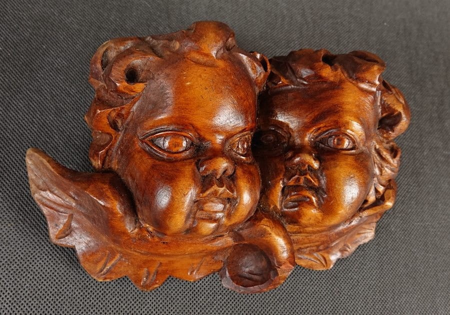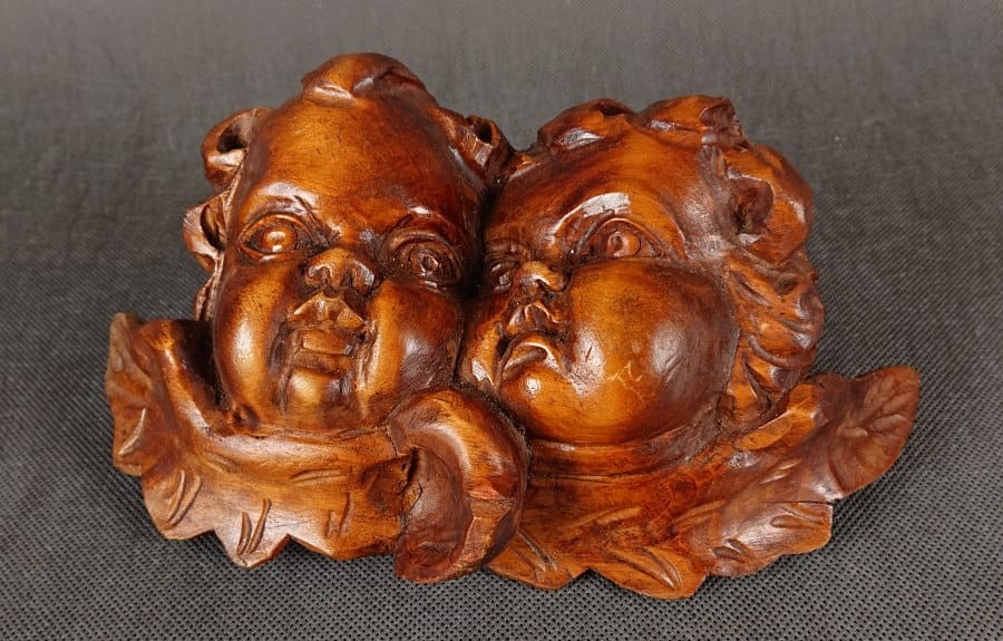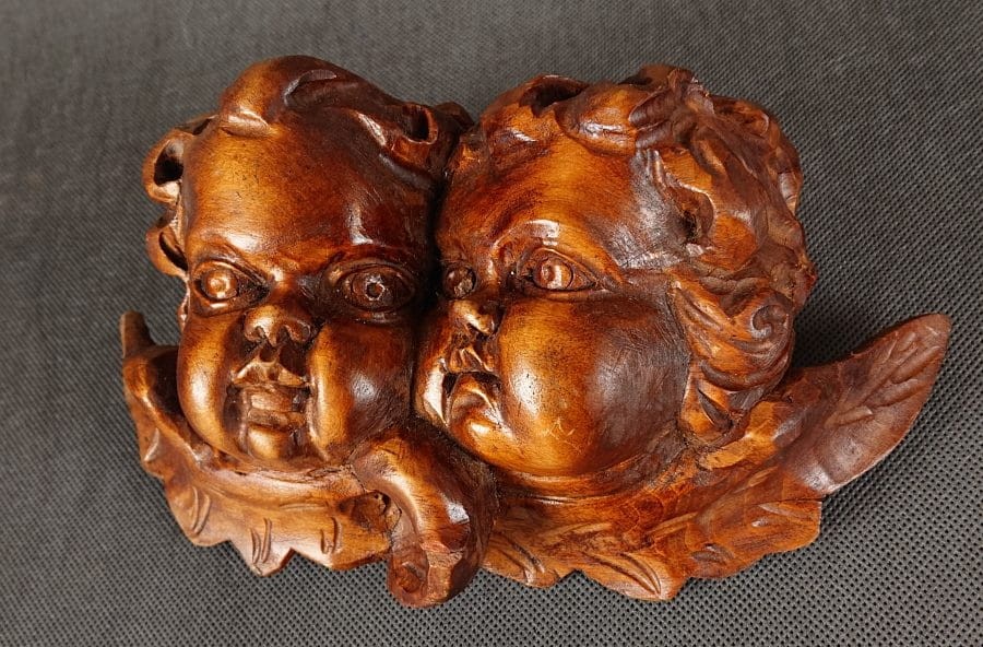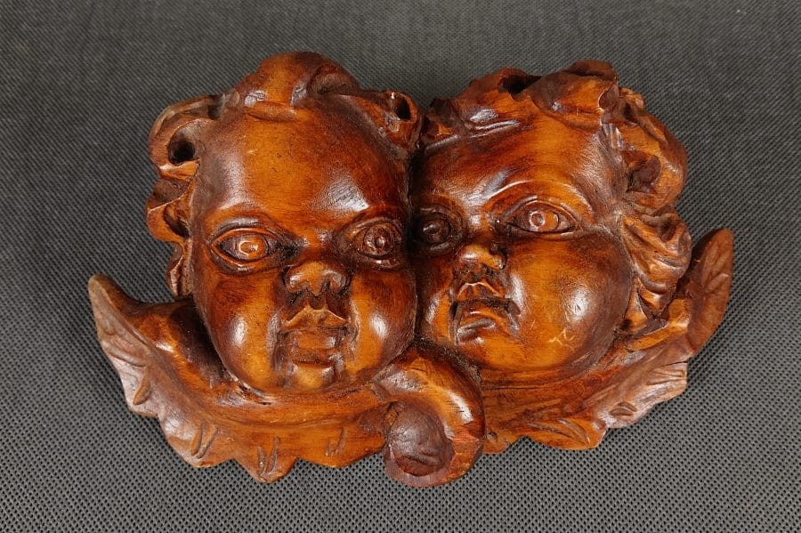 Rzeźba wykonana z ciepłego, polerowanego drewna przedstawia dwie złączone główki amorów. Pulchne, dziecięce twarze o delikatnie wyrazistych rysach – zaokrąglonych policzkach, subtelnie zarysowanych ustach i dużych, pełnych ciekawości oczach – zdają się zwracać ku sobie z czułością. Ku dołowi rozpościerają się niewielkie, stylizowane skrzydełka, wyrzeźbione z finezyjną precyzją piór i ozdobione łagodnymi żłobieniami. Każda lokowana fryzura składa się z misternie ukształtowanych kosmyków, które opadają w miękkich falach na szyje i czoła. Naturalna faktura drewna, miejscami podkreślona patyną, ożywia rzeźbę subtelnymi kontrastami jaśniejących i przyciemnionych fragmentów. Całość tworzy wyważoną kompozycję, w której niewinna uroda amorów harmonijnie łączy się z barokowym charakterem dekoracji, nadając przedmiotowi historycznego uroku i artystycznej wartości. Wykonana w latach 20 - 30. XX wieku.