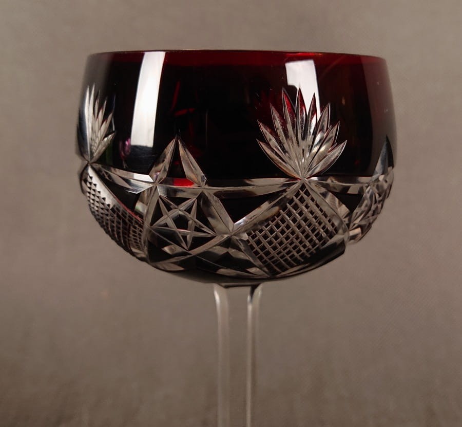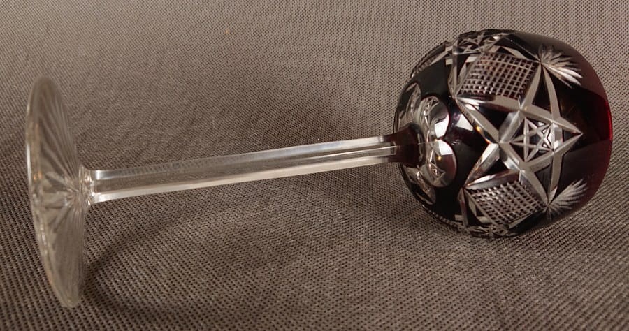 Kielich jest wykonany z wysokiej jakości szkła kryształowego, cechującego się głębokim, intensywnym czerwonym kolorem (rubinowym), który jest typowy dla szkła nakładanego (overlay) lub barwionego w masie. Doskonała przejrzystość i blask bezbarwnych, szlifowanych partii kontrastują z głęboką czerwienią, tworząc wyrafinowany efekt wizualny. Posiada klasyczną, elegancką formę, typową dla kielichów przeznaczonych do wina.