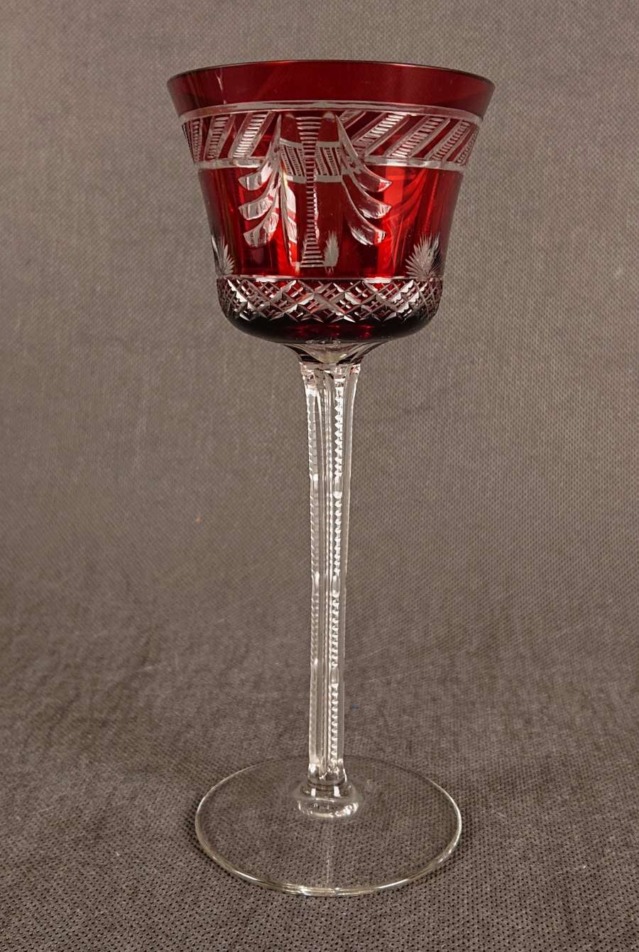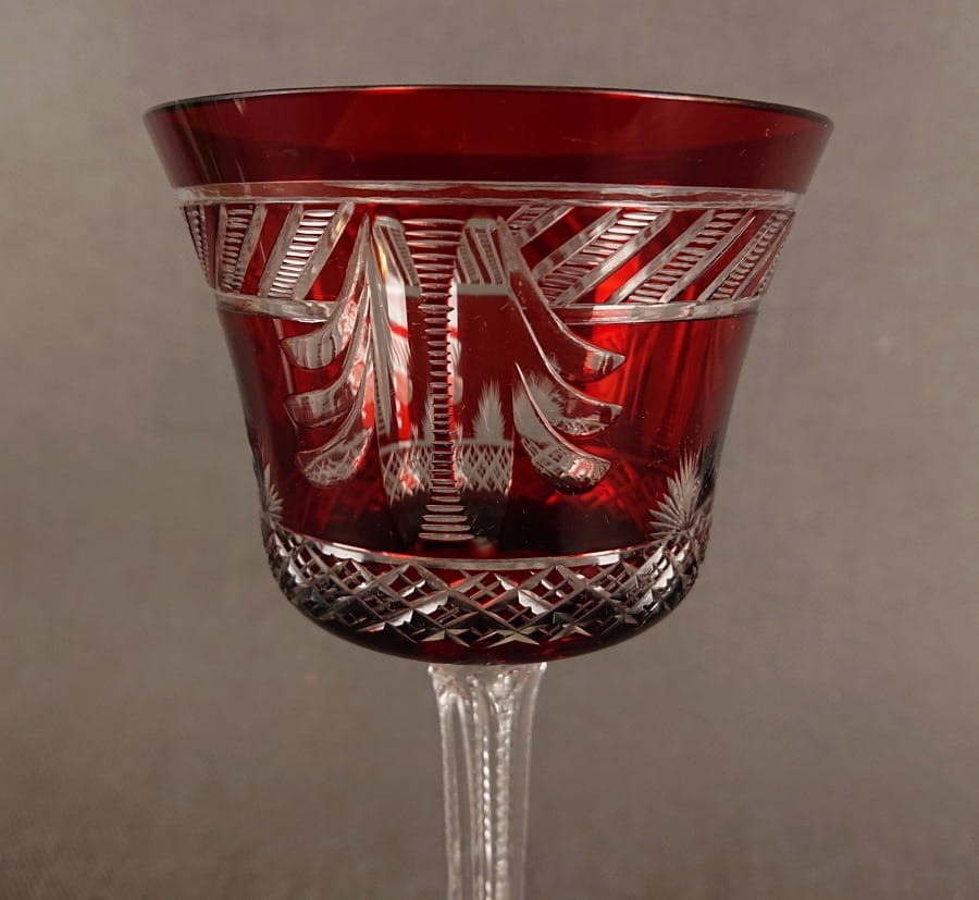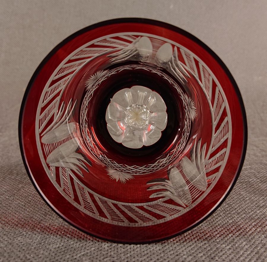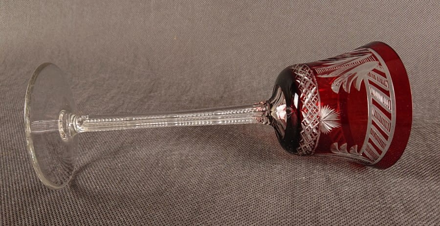 Ten bordowy kielich jest pięknym przykładem przedwojennego rzemiosła szklarskiego, charakteryzującym się wysoką jakością wykonania, precyzyjnymi szlifami i atrakcyjnym kolorem, mimo braku informacji o konkretnej hucie.