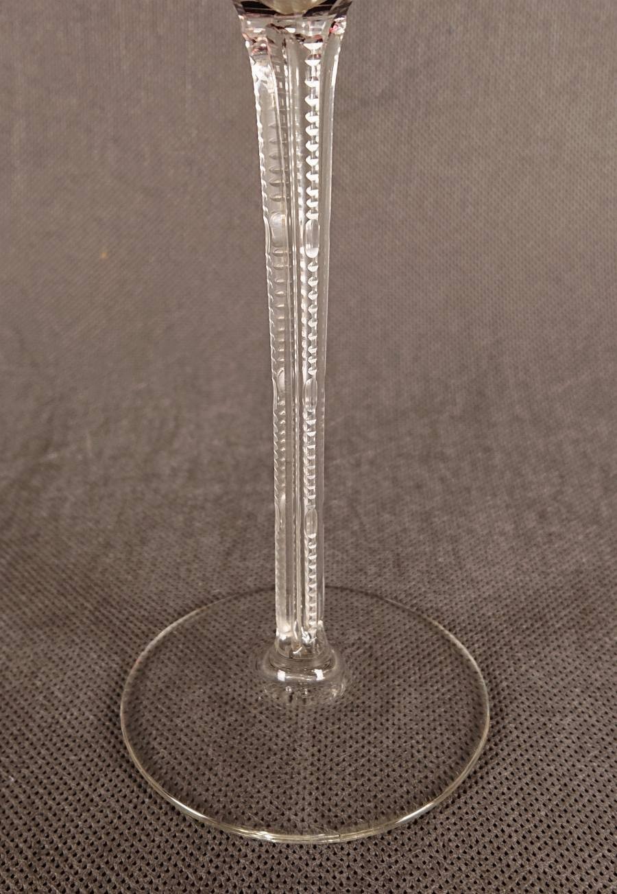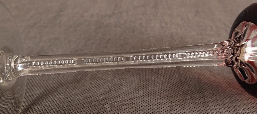Zdobienie: Noga posiada pionowe fasetowania na całej swojej długości. Dodatkowo, tuż pod czaszą, widoczne jest wyraźne, fasetowane zgrubienie, przypominające spłaszczoną kulę lub duży koralik, które jest również precyzyjnie szlifowane, co dodaje jej ozdobności.