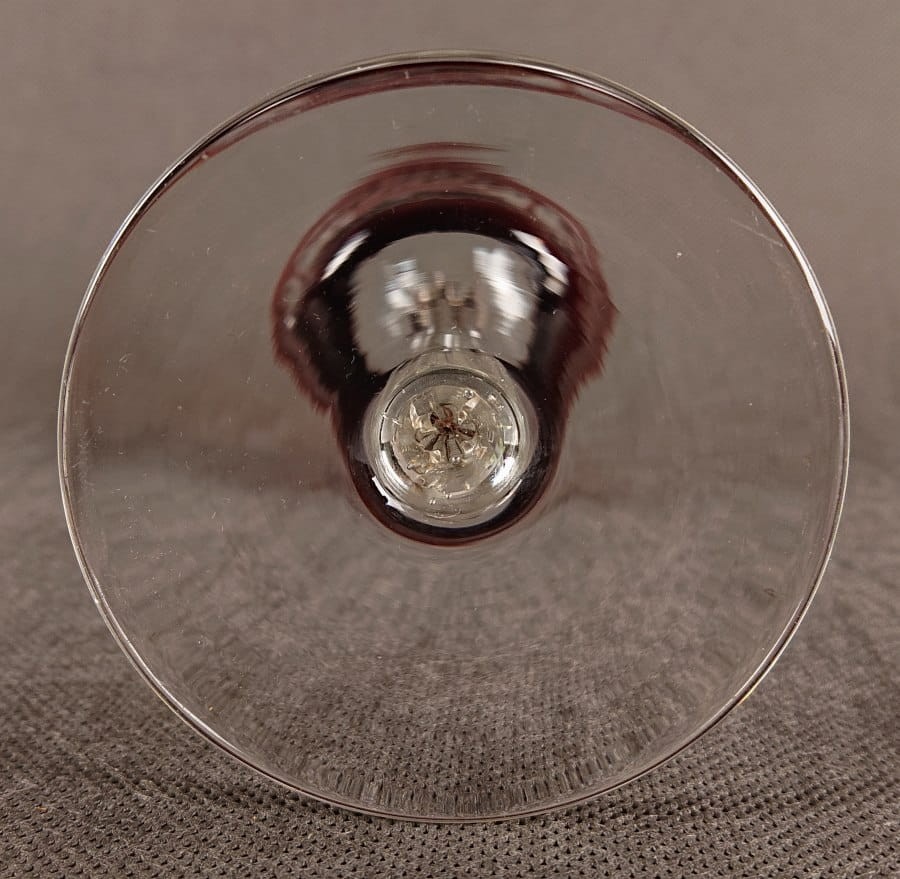 Kielich charakteryzuje się klasyczną, elegancką formą, typową dla okresu przedwojennego. Jego najbardziej uderzającą cechą jest intensywna, transparentna bordowa barwa szkła, która pięknie załamuje światło. Proporcje są harmonijne, a detale świadczą o rzemieślniczym kunszcie, nawet pomimo nieznanego pochodzenia huty.