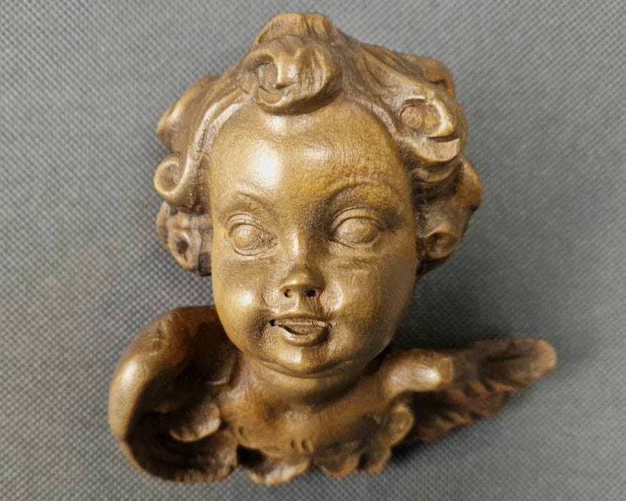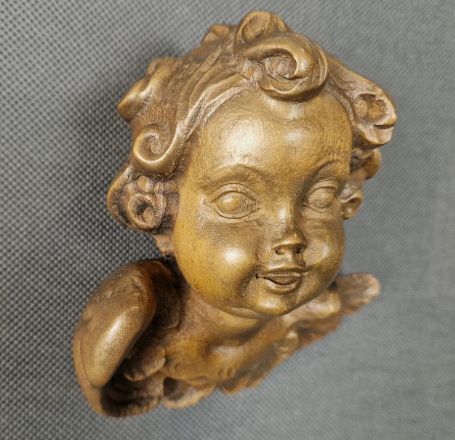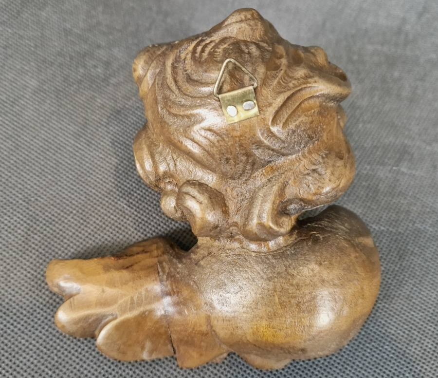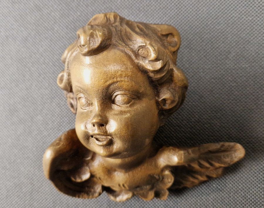 Amorek, aniołek, głowa wyrzeźbiona w drewnie, wykończone politurą i woskiem. Przedmioty ręcznie wyrzeźbione w drewnie, odzwierciedlający liczne szczegóły. Pochodzą z Tyrolu niemieckiego lub włoskiego. Wykonana w latach 60 - 70 XX wieku. Imponujący cherubinek do kolekcji.