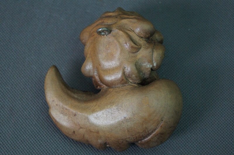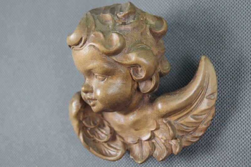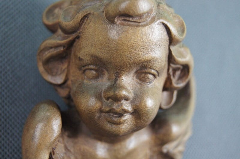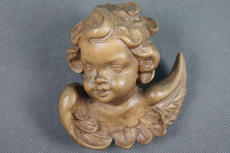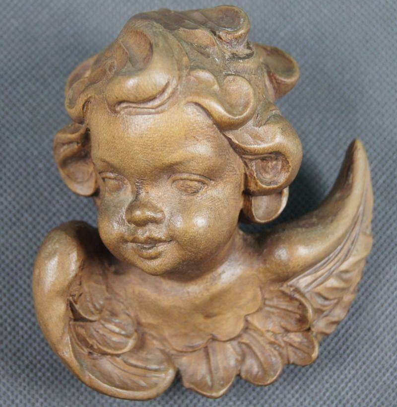 Wyrzeźbiona w drewnie główka (amora, amorka, aniołka, kupidynka) wykończona woskiem. Przedmiot ręcznie wyrzeźbiony w drewnie, odzwierciedlający liczne szczegóły. Pochodzi z Tyrolu niemieckiego lub włoskiego. Wykonany w latach 60, XX wieku. Imponujący kupidynek do kolekcji.