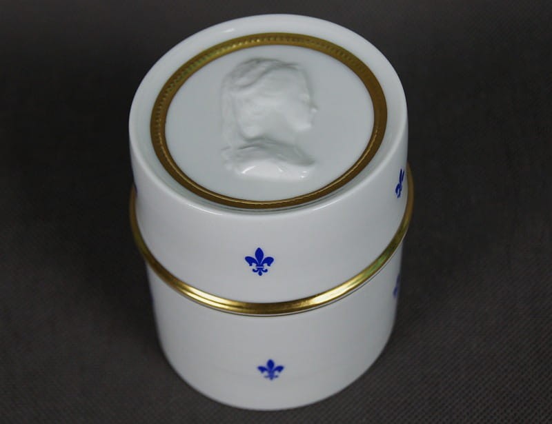 Wyjątkowa porcelanowa piękność, wykonana ze śnieżno białej porcelany, głównym elementem zdobniczym jest kamea w formie medalionu umiejscowiona na pokrywie, dodatkowo eleganckie złocenia. To ta prezentowana wyjątkowa porcelanowa bomboniera na bibeloty - cukierki - ciastka i inne przedmioty. Niezwykle wyjątkowa forma i zdobnictwo to atuty tej wyjątkowo bardzo pięknej bombonierki. Wykonana w niemieckiej renomowanej wytwórni porcelany. Przedmiot idealny do kolekcji jak i codziennego użytku.