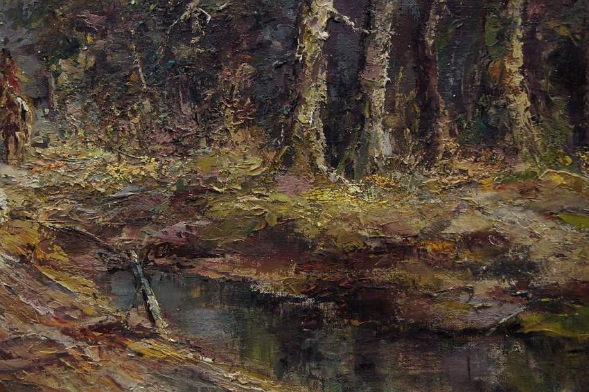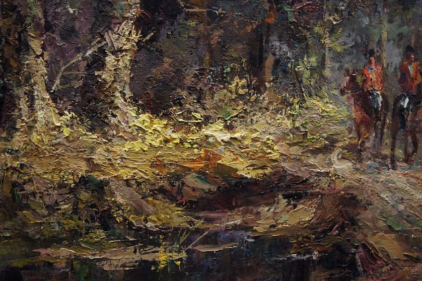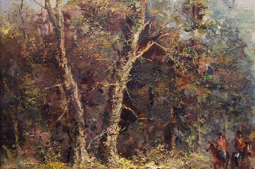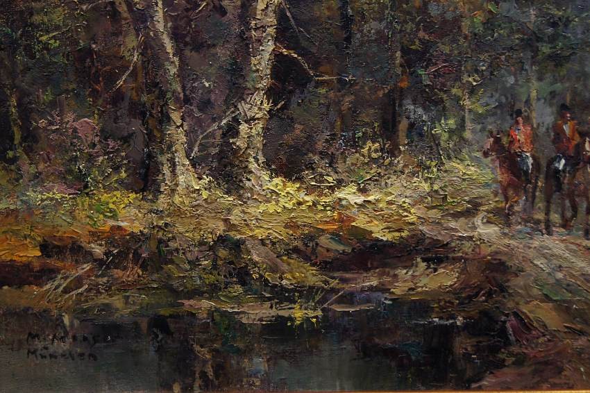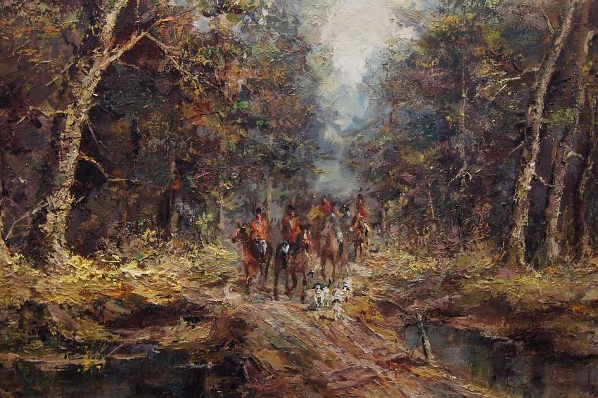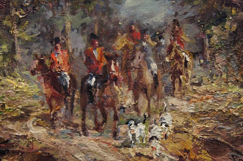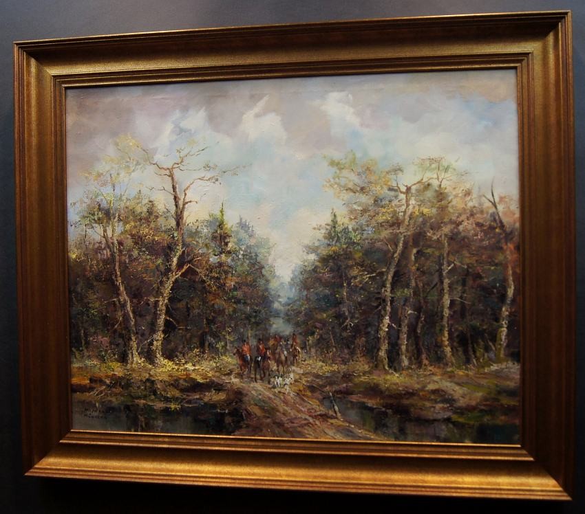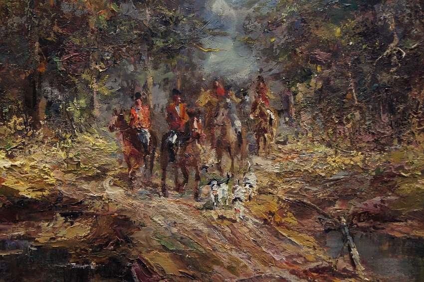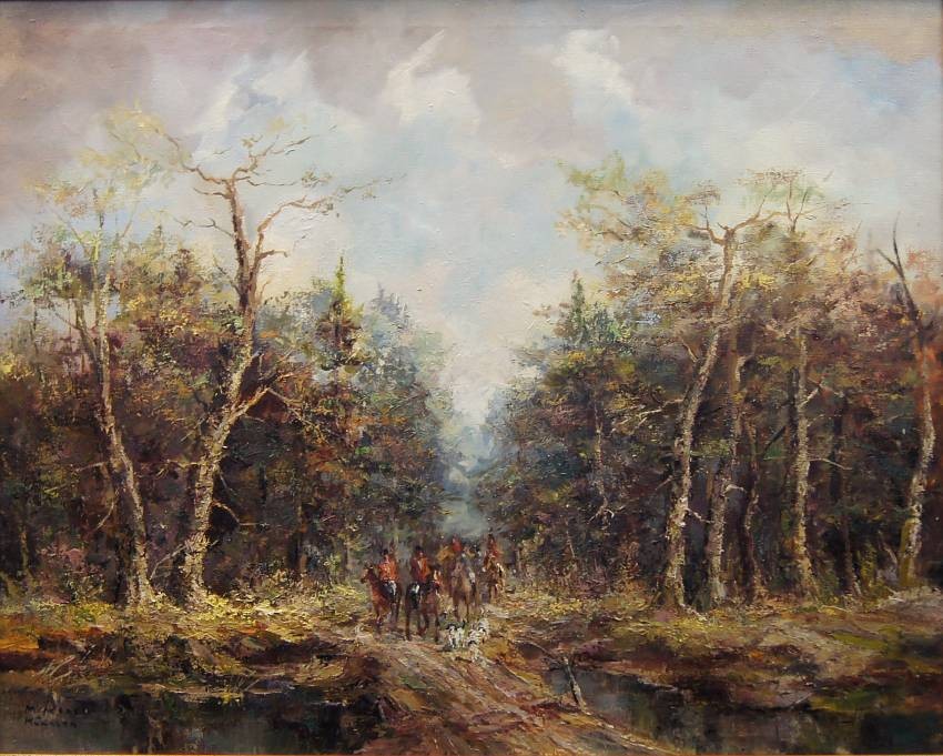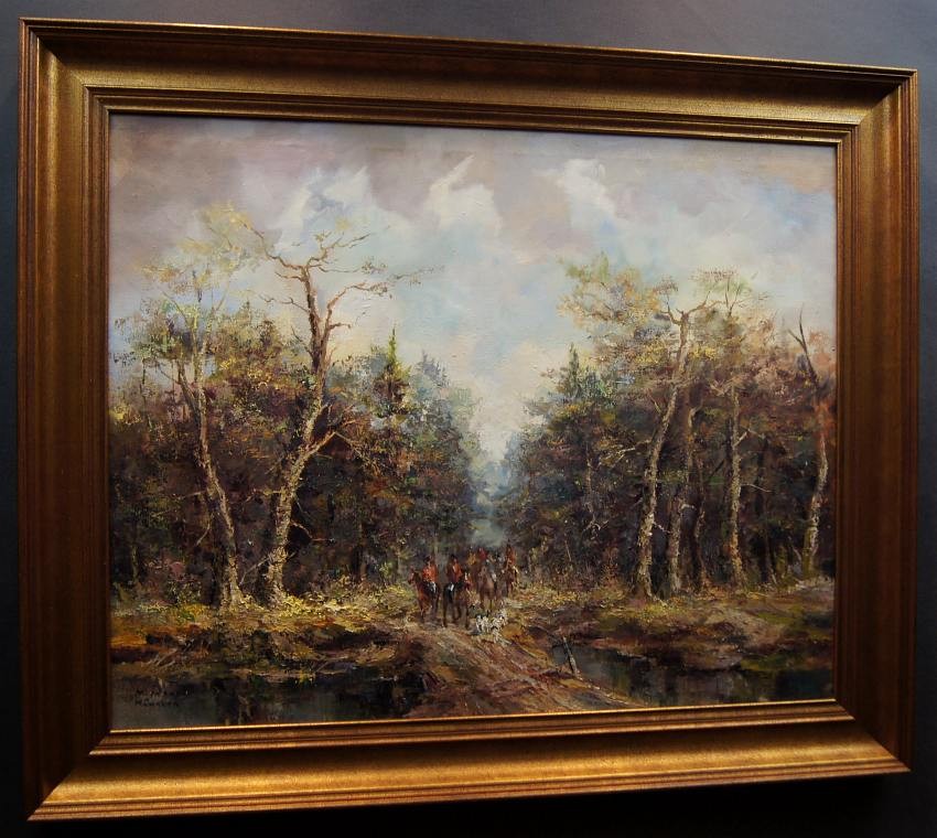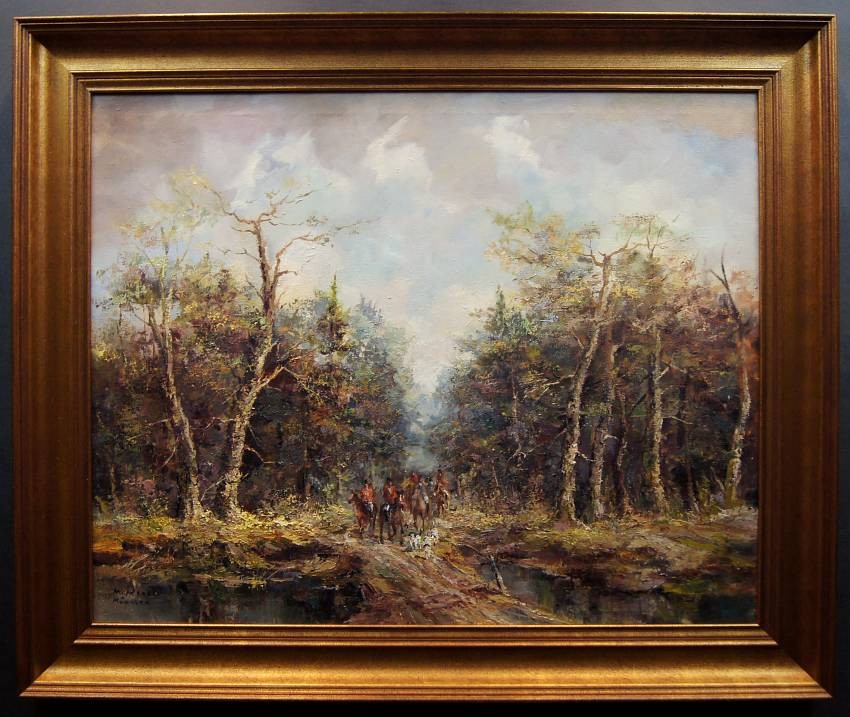 Duży, niezwykle dekoracyjny obraz przedstawiający krajobraz leśny z myśliwymi na koniach z psami które podjęły trop. Autorem tej pracy jest znany i ceniony niemiecki malarz. Sygnowany odręcznie przez autora w lewym dolnym rogu: M.Mooser - Munchen. Płótno oprawione w oryginalną, wyjątkowo stylową dobrze dobraną ramę w kolorze złotym z okresu powstania obrazu. Obraz godny polecenia jest niezwykle dekoracyjny i niesztampowy dla twórczości artysty.