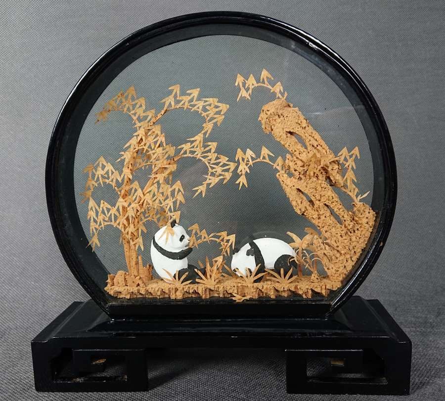 Oferujemy piękną dużą chińską dioramę. Przedmiot został wykonany w XX wieku przez wykwalifikowanego chińskiego rzemieślnika. Diorama przedstawia dwie pandy w naturalnym środowisku leśnym. Wykonana z korka i drewna malowanego na czarno, zabezpieczona dwustronnie szybą.