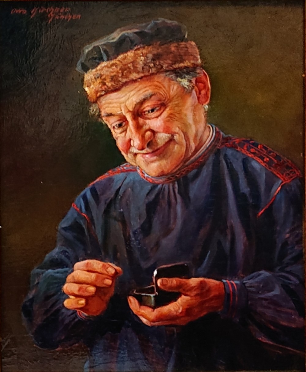 O ARTYŚCIE: Otto Kirchner - artysta malarz pochodzenia niemieckiego żyjący w latach (1887 - 1960). Naukę malarstwa rozpoczął w Düsseldorfie w prywatnej pracowni, później kształcił się we Włoszech, a w latach (1912-1914) w Akademii Sztuk Pięknych w Monachium u profesora M. Feuersteina, znanego jako malarza scen religijnych. Kirchner sam także malował obrazy o tematyce religijnej, ale przede wszystkim znany jest jako malarz obrazów o tematyce rodzajowej. Jego specjalnością były zwłaszcza portrety mężczyzn zajętych czytaniem gazet, palących fajki czy pijących wino. Cechowała je dosadna charakterystyka modeli oraz nuta ciepłego humoru.