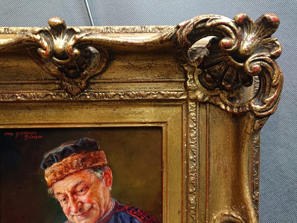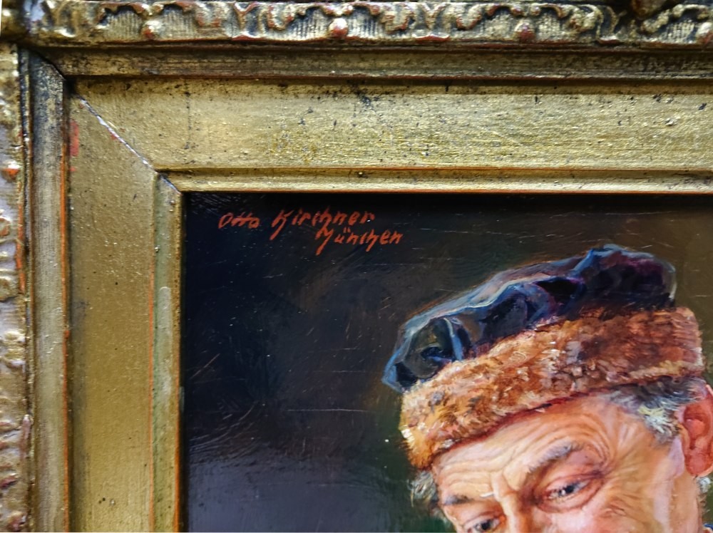 Sygnatura artysty widoczna jest w lewym górnym rogu, wykonana czerwonym pigmentem: Otto Kirchner München. Obraz oprawiono w bogato zdobioną, złoconą ramę o formach neobarokowych, typową dla ekspozycji prac o charakterze salonowym i dekoracyjnym.