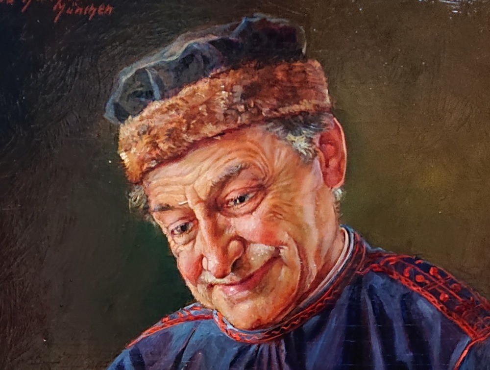 Postać ubrana jest w ciemny, ludowy kaftan z czerwonymi akcentami haftu oraz futrzaną czapką, co nadaje scenie regionalnego, środkowoeuropejskiego kolorytu i podkreśla typowość modela – „człowieka z ludu”.