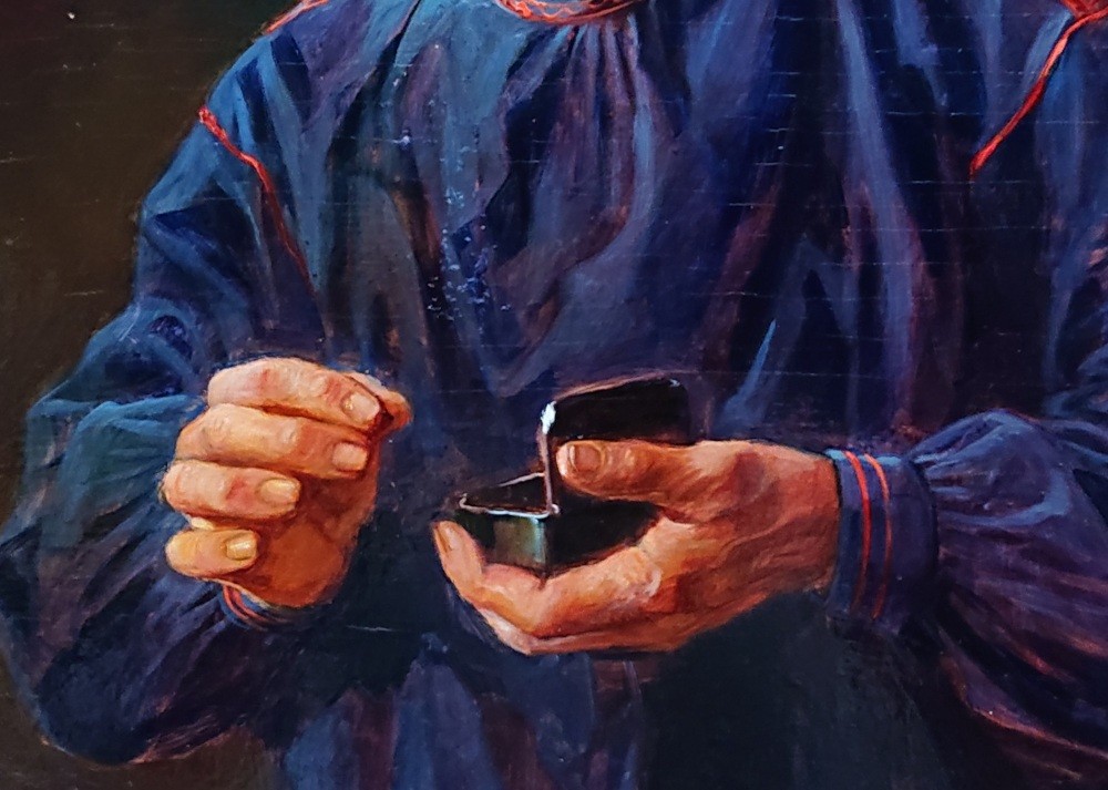 Obraz ukazuje starszego mężczyznę w półpostaci, ujętego na neutralnym, ciemnym tle, co pozwala skupić uwagę widza na ekspresji twarzy i geście rąk. Model pochyla się lekko nad niewielkim przedmiotem trzymanym w dłoniach (prawdopodobnie pudełkiem lub tabakierą), co wprowadza intymny, niemal anegdotyczny charakter sceny. Ujęcie to wpisuje się w typową dla Kirchnera tematykę codziennych, kameralnych czynności, ukazanych z dyskretną nutą ciepłego humoru.
