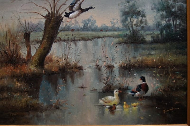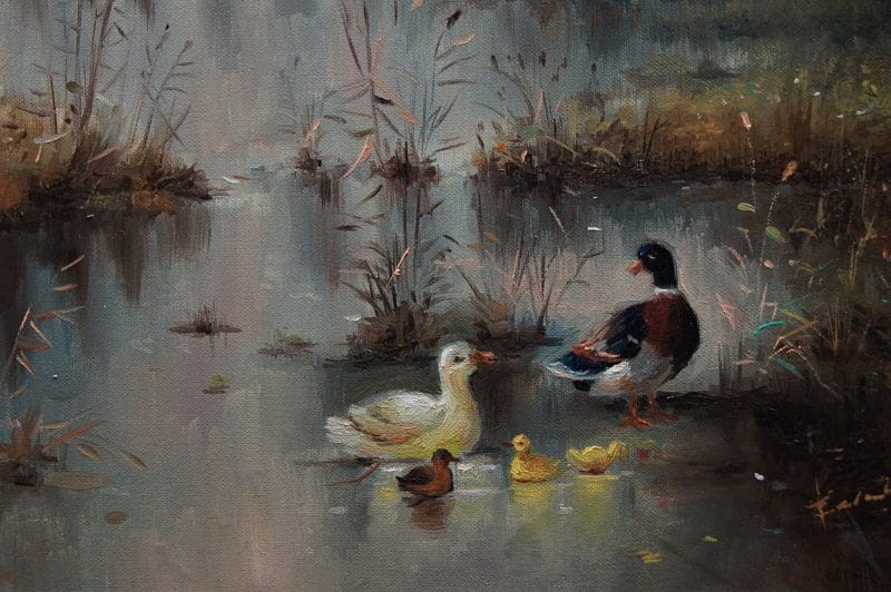 Niezwykle dekoracyjny obraz olejny malowany farbami olejnymi na płótnie. Wyjątkowo ciekawa kolorystyka. Na pracy przedstawiony jest wizerunek uroczych, barwnych kaczek na łonie natury. Obraz tworzony w technice pędzla. Oprawiony w gustowną drewnianą ramę w kolorze złotym. Sygnowany w prawym dolnym narożniku- Trätzl.