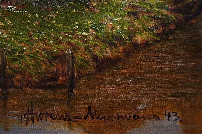 Wyjątkowo dekoracyjny, oryginalny, autentyczny, dużych rozmiarów obraz malowany farbami olejnymi na płótnie, techniką malarską: pędzel. Sygnowany lewy dół: Lorenz-Murowana 1943. Niezwykła gra kolorów. Całość oprawiona w oryginalną, starą, dekoracyjną przestrzenną ramę. Obrazy artysty cieszą się dużym powodzeniem na aukcjach sztuki. Portal notowań aukcyjnych Artprice odnotowuje 313 sprzedanych dzieł tego artysty. Stan zachowania bardzo dobry nie wymaga jakichkolwiek interwencji. Wymiary: całości z ramą 98 cm x 128 cm, płótno 70 cm x 100 cm.