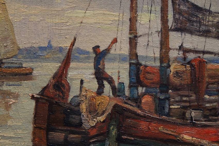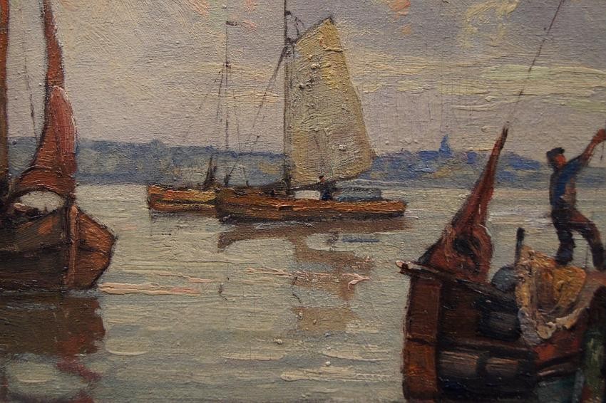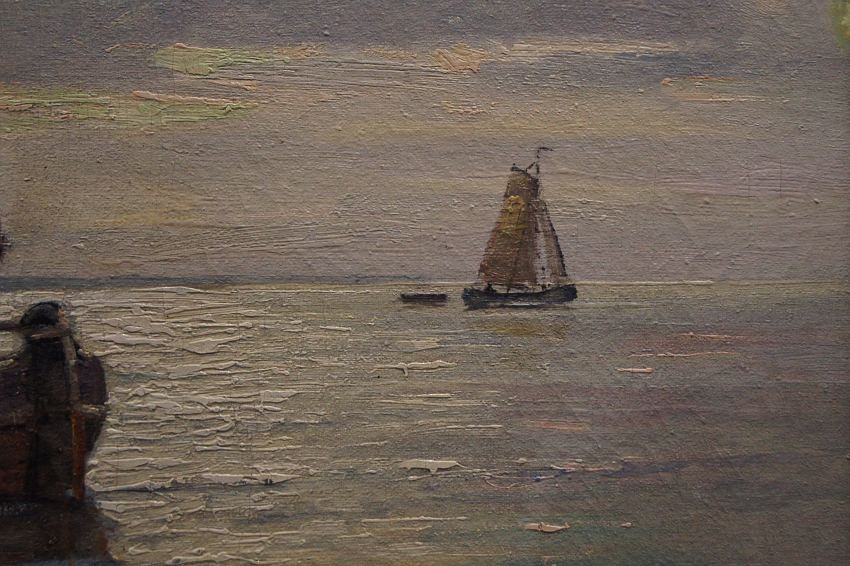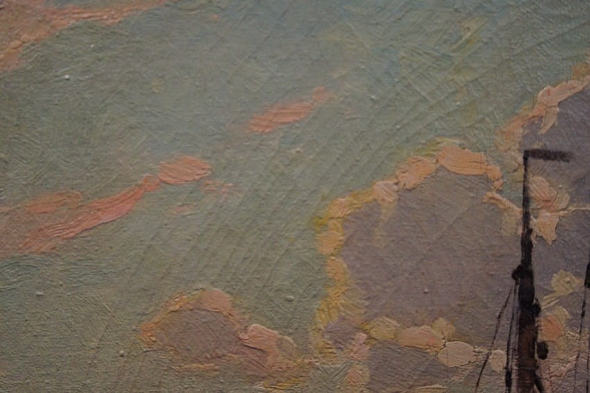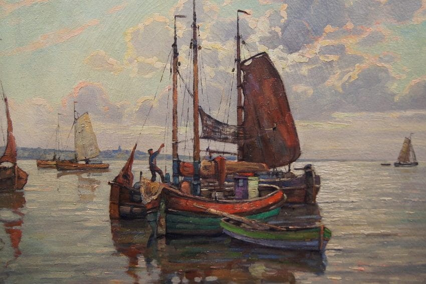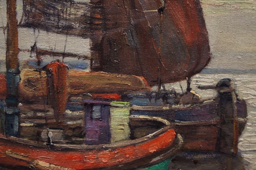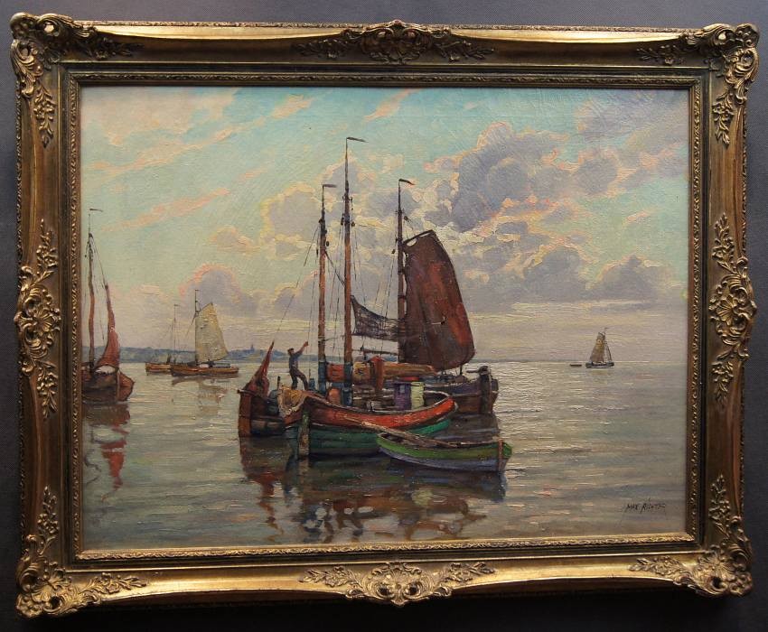 Oryginalny, niezwykle widowiskowy marynistyczny obraz olejny na płótnie naciągniętym na krosno. Autorem tej pracy jest znany i ceniony aukcyjny artysty. Zdecydowane i śmiałe pociągnięcia pędzla artysty, świadczą o wysokim kunszcie malarskim. Sygnowany odręcznie przez artystę w prawym dolnym narożniku lewy dół: Max Richter. Na obrazie artysta uwiecznił scenę, na której pokazane jest wybrzeże holandii z kutrami rybackimi. Praca tętniąca życiem, emanująca pastelowymi kolorami w jakich została wykonana. Obraz został namalowany w pierwszej połowie XX wieku. Struktura nałożonej farby jest uwypuklona i wyczuwalna pod palcami.
