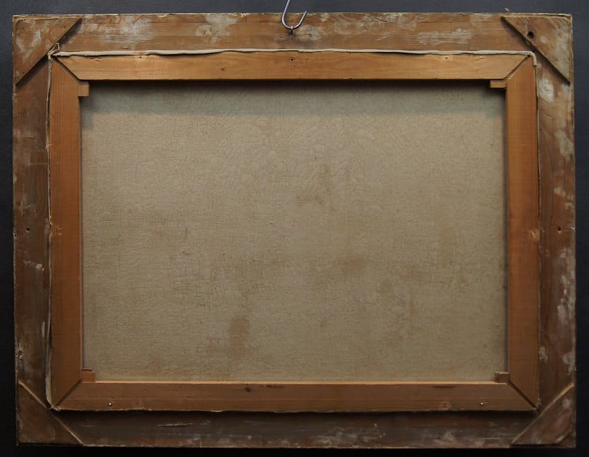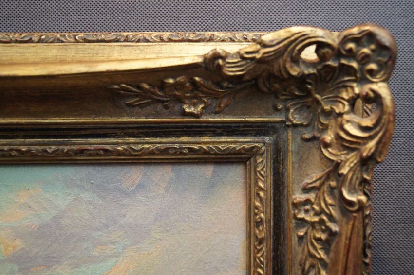 Obraz oprawiony w oryginalną, starą, okazałą przestrzenną ramę w kolorze ciemnego złota Obraz polecamy koneserom cennego i dobrego malarstwa. Obrazy artysty cieszą się dużym powodzeniem i są pożądane na aukcjach dzieł sztuki.