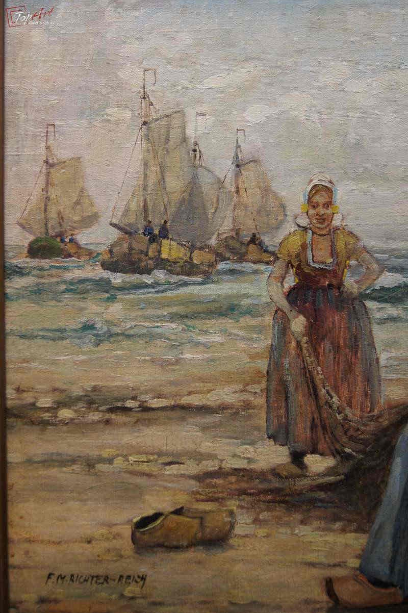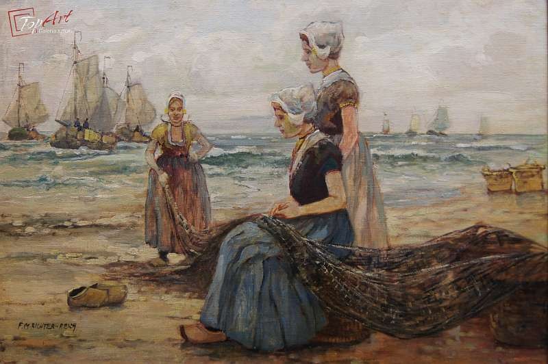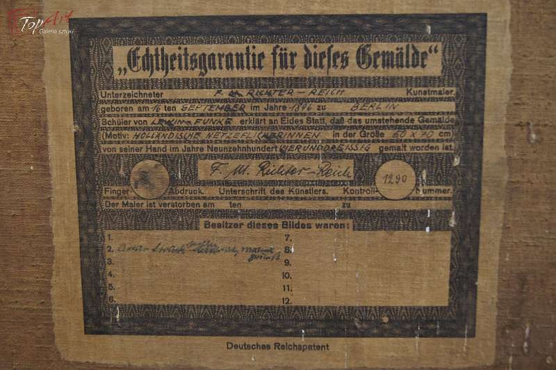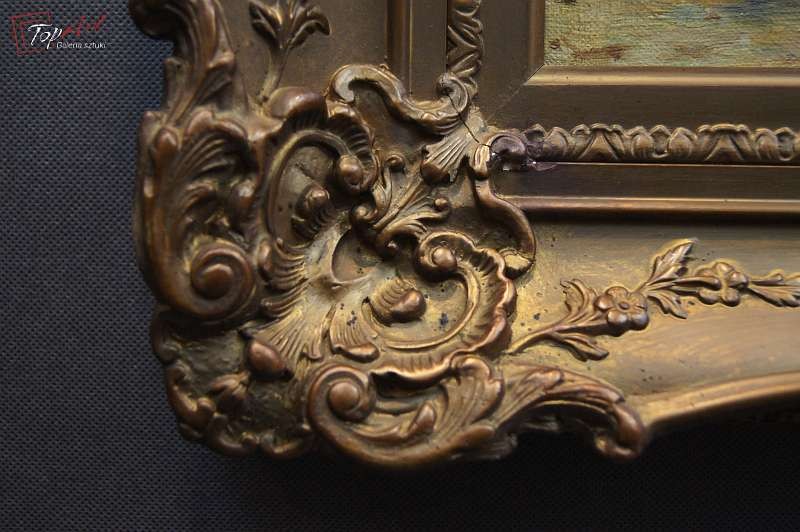 Oryginalny niezwykle dekoracyjny obraz malowany farbami olejnymi na płótnie.Techniką malarską: pędzel. Sygnowany lewy dół: F. M.Richter - Reich Całość oprawiona w oryginalną, starą, okazałą przestrzenną ramę. Obraz polecamy koneserom cennego i dobrego malarstwa. Obrazy artysty cieszą się dużym powodzeniem i są pożądane na aukcjach sztuki. Portal notowań aukcyjnych Artprice odnotowuje 152 sprzedanych dzieł tego artysty Stan zachowania bardzo dobry nie wymaga jakichkolwiek interwencji. Wymiary: całości z ramą 70 cm x 90 cm, płótno 50 cm x 70 cm.