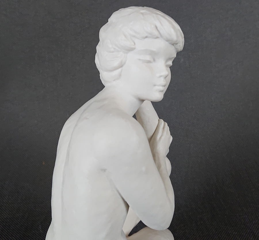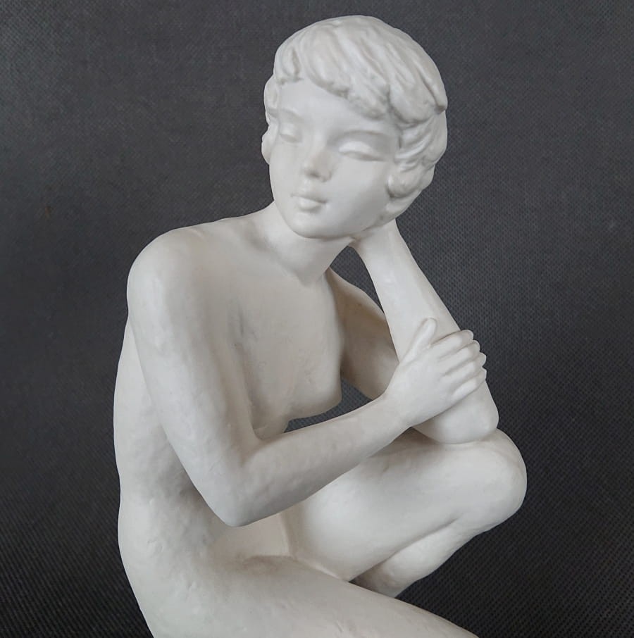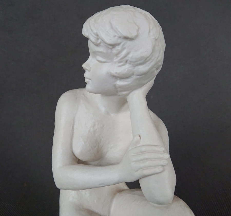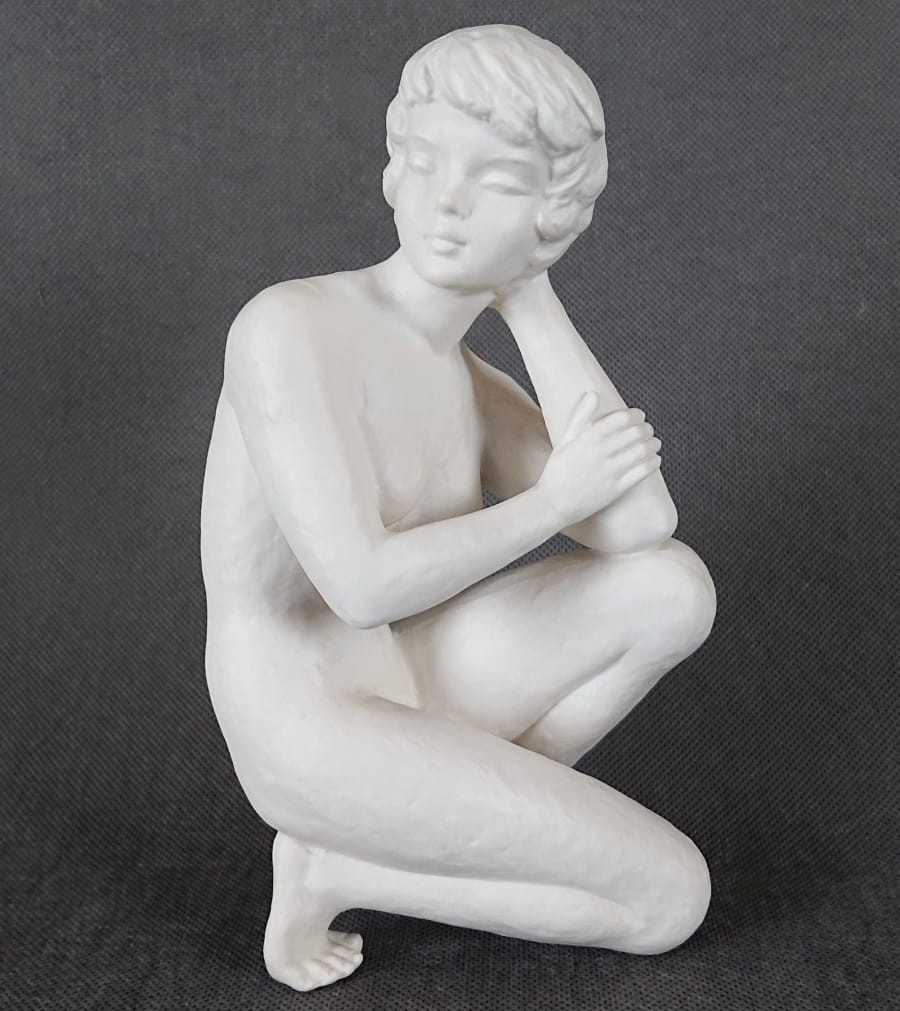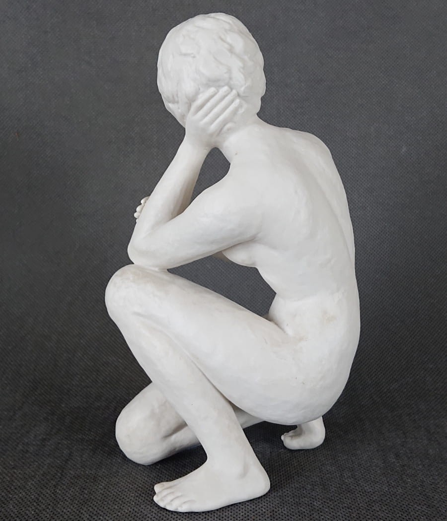 Oryginalna duża porcelanowa figurka przedstawiająca zamyśloną nagą postać kobiety. Wykonana ze śnieżnobiałej porcelany w półmatowej glazurze. Zaprojektowana przez światowej sławy niemieckiego artystę Gerharda Skrobka, co jest gwarancją perfekcyjnego wymodelowania i dbałością o szczegóły. Sygnowana wyciśniętymi inicjałami projektanta Skro model: FN 73, dodatkowo znakiem firmowym od dołu podstawy. Kolekcjonerska porcelana o niezwykle wyszukanym i eleganckim kształcie i znanej marce.