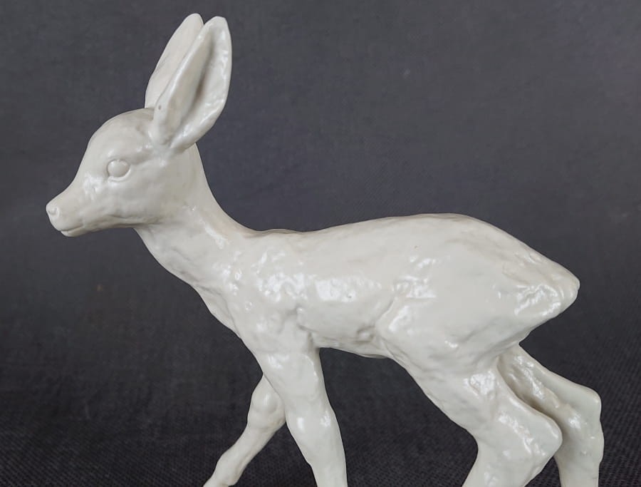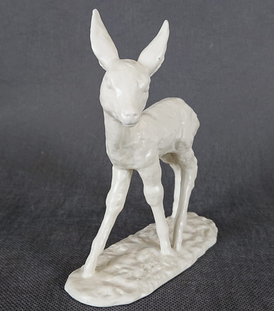 Porcelanowa figurka marki Schaubach‑Kunst przedstawia delikatną sylwetkę młodego sarenki w ruchu. Wykonana została z białej porcelany z lekkim połyskiem. Figurkę wyrzeźbiono z dbałością o detale anatomiczne: smukłe, falujące nogi, wydłużoną szyję i charakterystyczne, duże uszy, nadające postaci wyraz czujności.