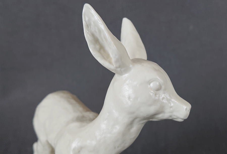 Podstawa ma nieregularny, naturalistyczny zarys, przypominający ziemię lub trawę, co wprowadza wrażenie spaceru zwierzęcia po lesie. Powierzchnia został lekko pofalowana, a drobne wgłębienia i załamania szkliwa subtelnie sugerują strukturę sierści i nierówności gruntu. Monochromatyczna biel porcelany podkreśla prostotę formy i elegancję, dając klarowny kontur sylwetki.