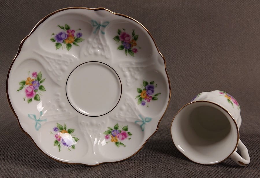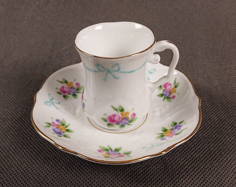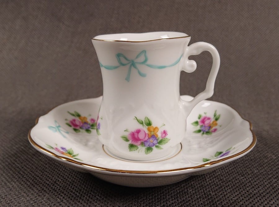 Filiżanka jest wykonana z białej, lśniącej porcelany. Ma elegancki, prosty kształt, z delikatnie rozszerzającym się ku górze korpusem. Jej dekoracja jest bardzo subtelna, składająca się głównie z ręcznie malowanych motywów kwiatowych. Na korpusie filiżanki widnieją małe bukiety kwiatów w pastelowych odcieniach różu, fioletu, żółci i błękitu, z zielonymi liśćmi. Tuż pod rantem filiżanki znajduje się delikatny, błękitny motyw przypominający wstążkę lub kokardkę, co dodaje jej uroku i lekkości. Górny rant filiżanki jest cienko złocony. Uszko jest białe, o prostym, zaokrąglonym kształcie.