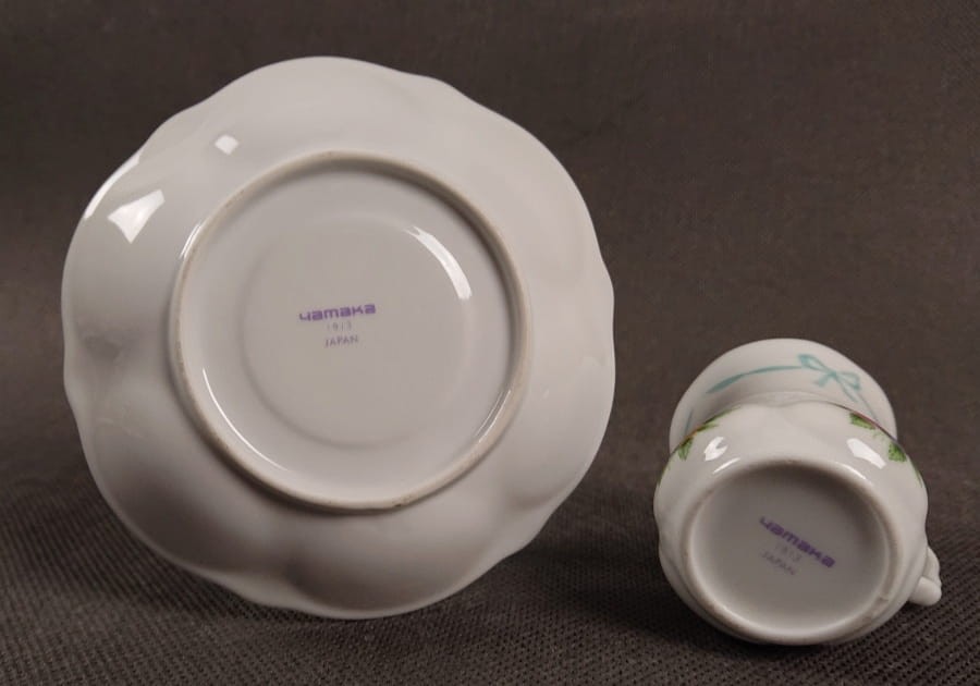 Spodek jest okrągły, z lekko falistymi brzegami, co nadaje mu delikatności. Na jego powierzchni znajdują się subtelne reliefy, prawdopodobnie w kształcie listków lub fal, które nadają mu trójwymiarowości. Podobnie jak filiżanka, spodek jest ozdobiony ręcznie malowanymi bukietami pastelowych kwiatów, symetrycznie rozmieszczonymi na białym tle. Między bukietami pojawiają się również delikatne błękitne wstążki, tworząc spójną całość z filiżanką. Zewnętrzna krawędź spodka jest cienko złocona. Na spodzie spodka widoczna jest sygnatura "Yamaka".