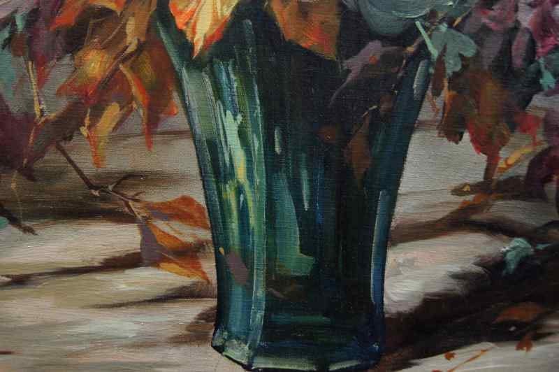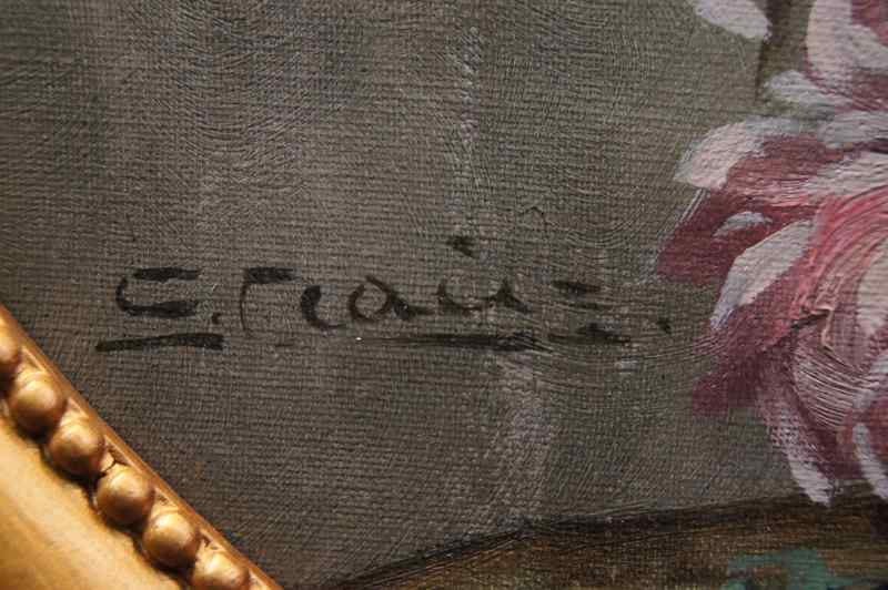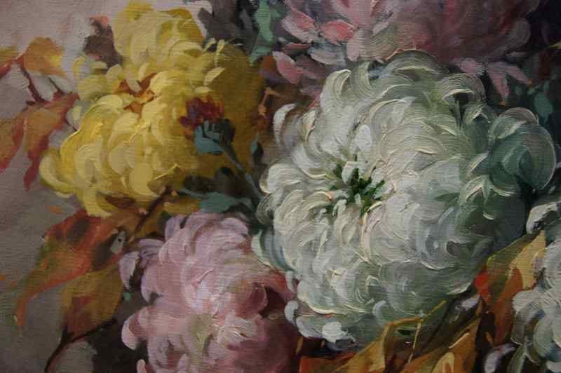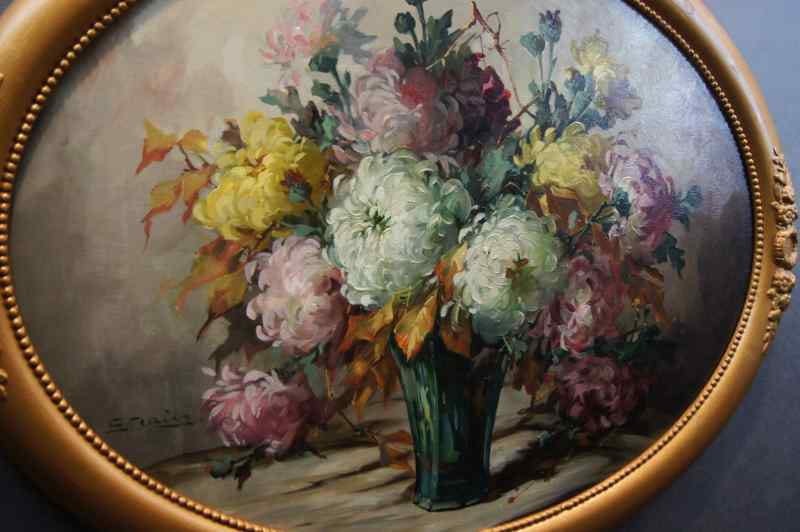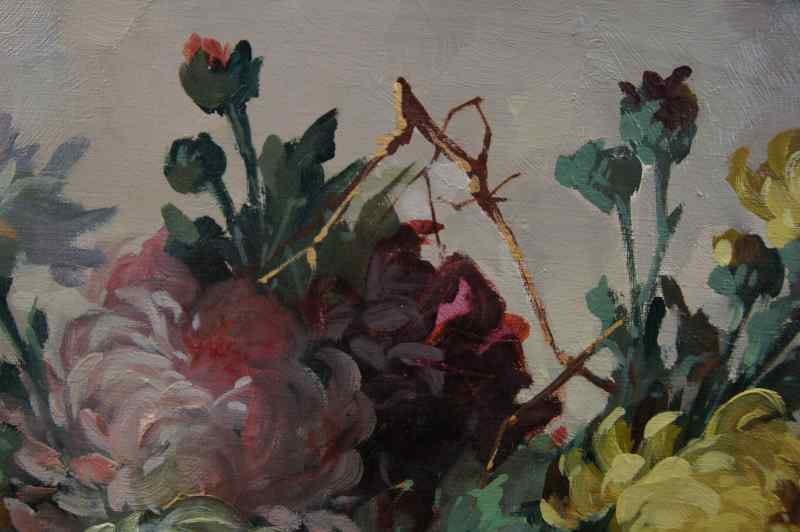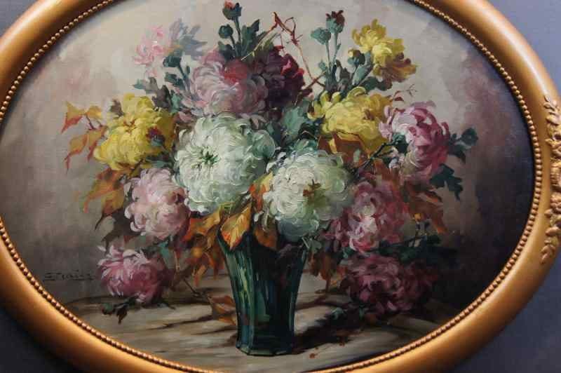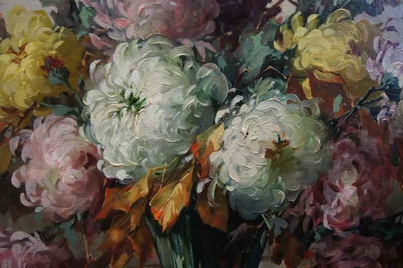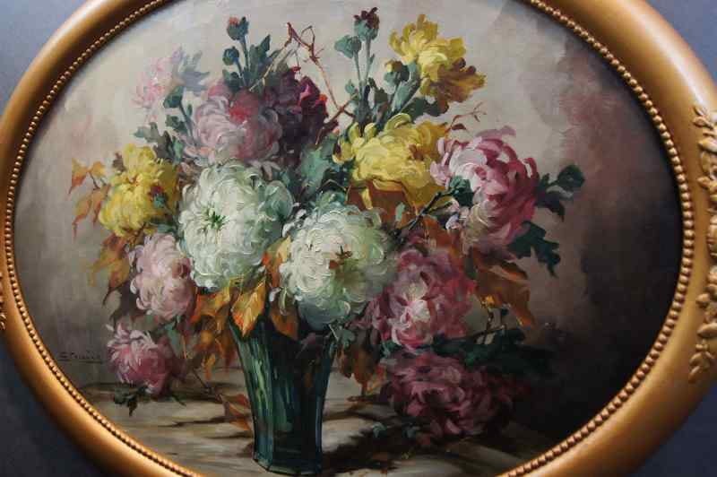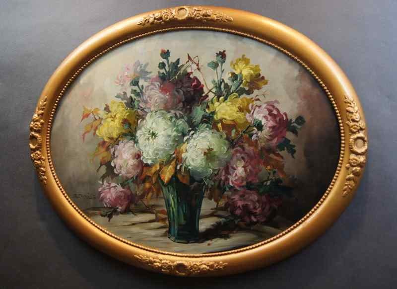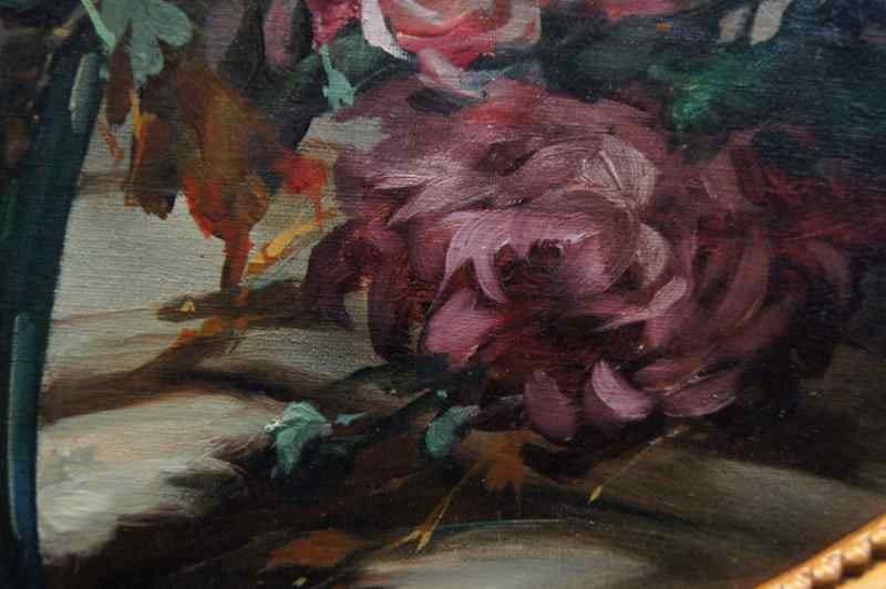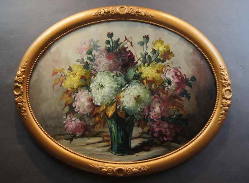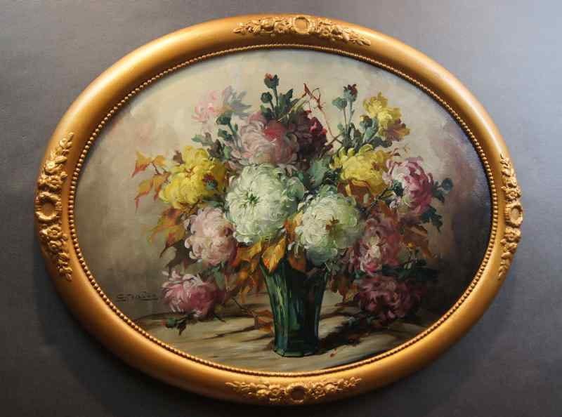 Oryginalny owalny, perfekcyjnie malowany obraz olejny na płótnie, przedstawiający martwą naturę ( piwonie). Obraz pochodzi z lat 20, 20 wieku. Autorem tej pracy jest Georg Claus. Obraz malowany w technice pędzla, struktura nałożonej farby wyczuwalna pod palcami. Sygnowany lewy dół: G.Claus. Całość oprawiona w oryginalną, przestrzenną ramę. Dzieło polecamy koneserom cennego i dobrego malarstwa. Obraz do powieszenia na ścianie.Stan zachowania: bardzo dobry - rama przemalowana domowym sposobem na złoty kolor. Wymiary: całości z ramą 71.5 cm x 91 cm, płótno 70 cm x 55 cm