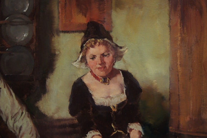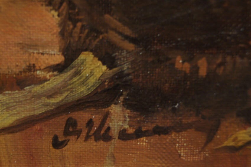 Oryginalny, perfekcyjnie namalowany obraz olejny o dużych rozmiarach, namalowany na płótnie. Dzieło o niezwykłych walorach dekoracyjnych. Autorem pracy jest znany i ceniony niemiecki artysta malarz. Dzieło sygnowane odręcznie przez artystę w lewym dolnym rogu "Dickmeis". Obraz malowany w technice pędzla, struktura nałożonej farby jest uwidoczniona. Oprawą obrazu jest rama o szerokiej listwie z okresu powstania obrazu, w kolorze ecru i szarym. Dzieło polecamy koneserom dekoracyjnego i dobrego malarstwa.