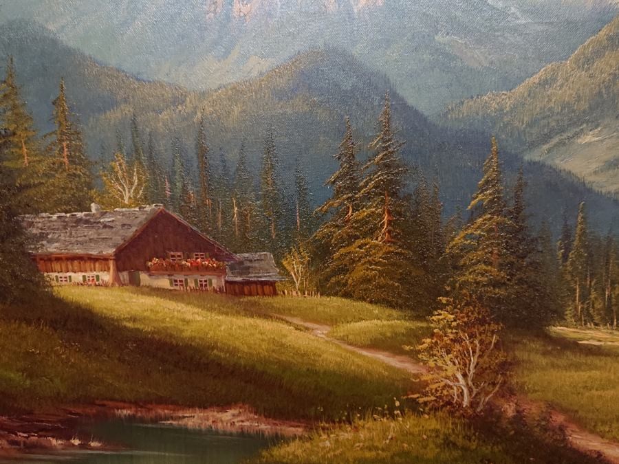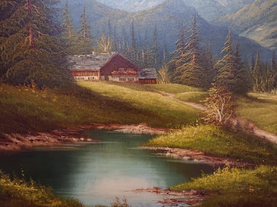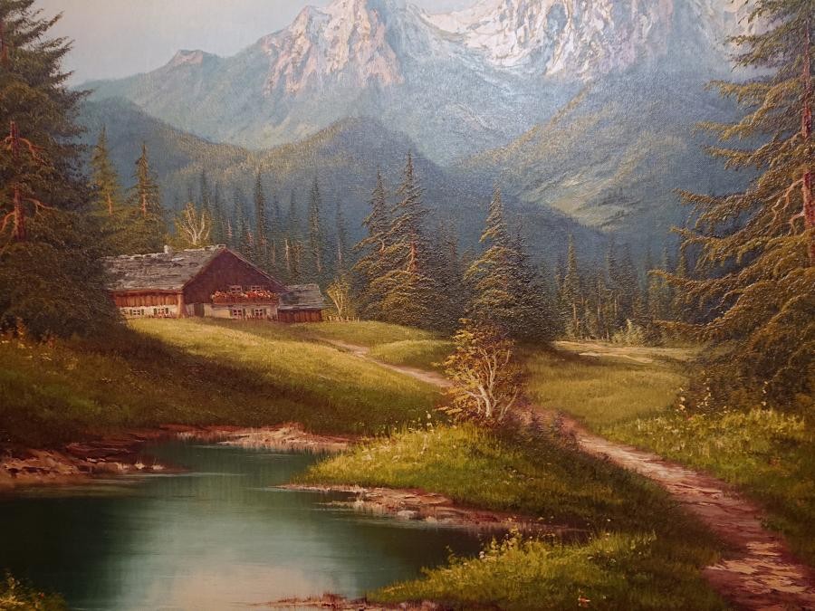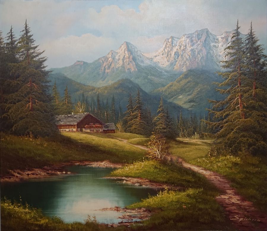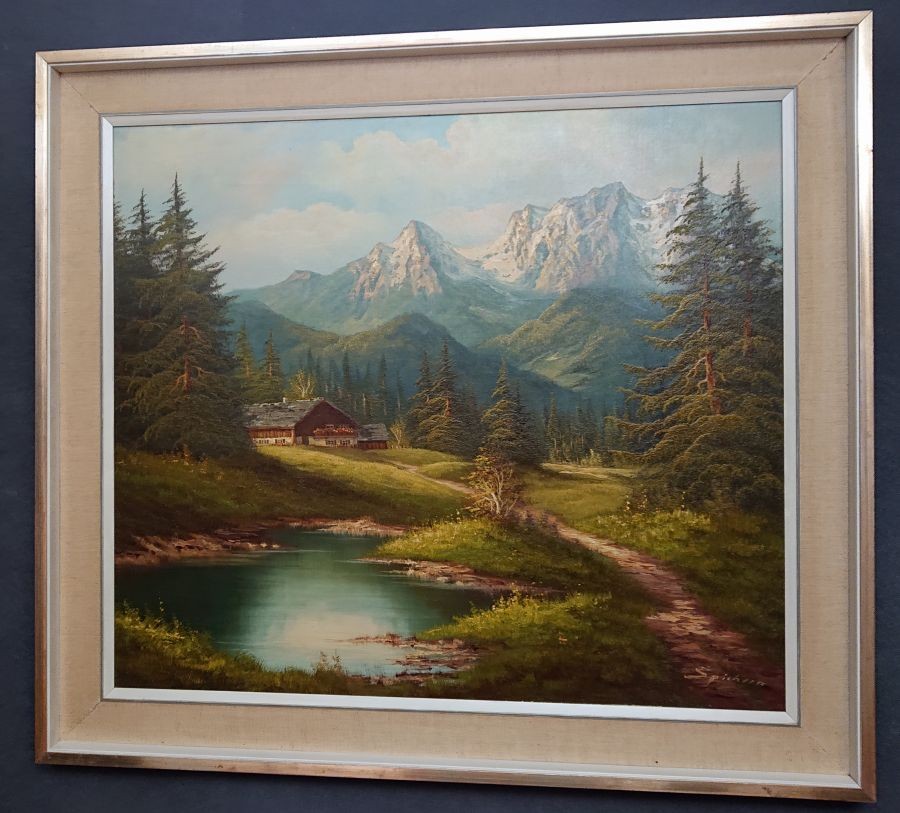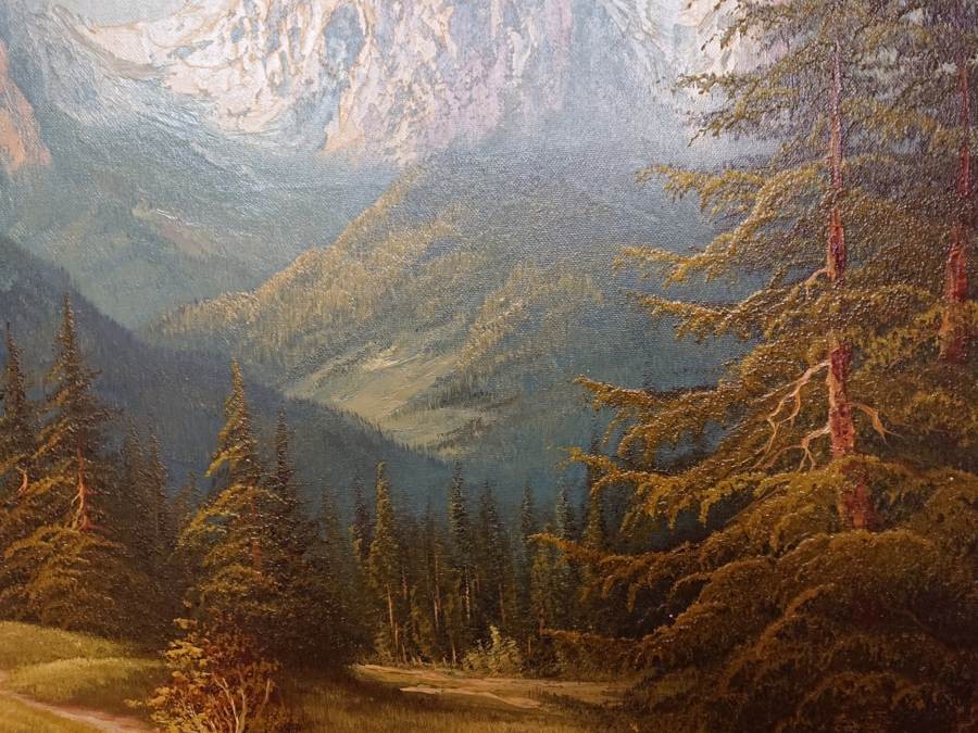 Prezentujemy Państwu wybitne dzieło Hansa Spicherna – artysty, który do perfekcji opanował sztukę uwieczniania majestatu gór. „Górska dolina z leśnym stawem” to popis warsztatowej biegłości szkoły monachijskiej, gdzie każdy element – od krystalicznej wody po ośnieżone szczyty – został oddany z niemal fotograficzną wiernością. Ten stary obraz olejny emanuje spokojem i harmonią, zapraszając widza w podróż do nienaruszonej przez człowieka natury. Prace Spicherna, cenione za autentyzm i mistrzowskie operowanie perspektywą powietrzną, stanowią ozdobę najbardziej prestiżowych kolekcji malarstwa pejzażowego.