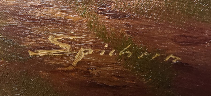 Sygnatura „Spichern” widoczna jest w prawym dolnym rogu, wykonana jasną farbą, nakładaną zdecydowanym, lekko impastowym ruchem. Sposób podpisu jest zgodny z praktyką artysty z tego okresu.