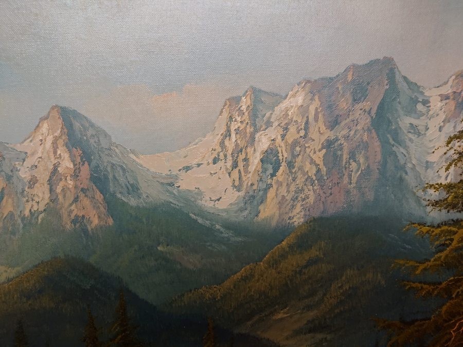 Obraz wykonany jest techniką olejną na płótnie. Widoczna jest faktura impastu w partiach drzew, traw oraz gór, zwłaszcza w detalach światła na skałach i igliwiu. Pociągnięcia pędzla są kontrolowane i precyzyjne, typowe dla malarstwa realistycznego o charakterze dekoracyjnym.