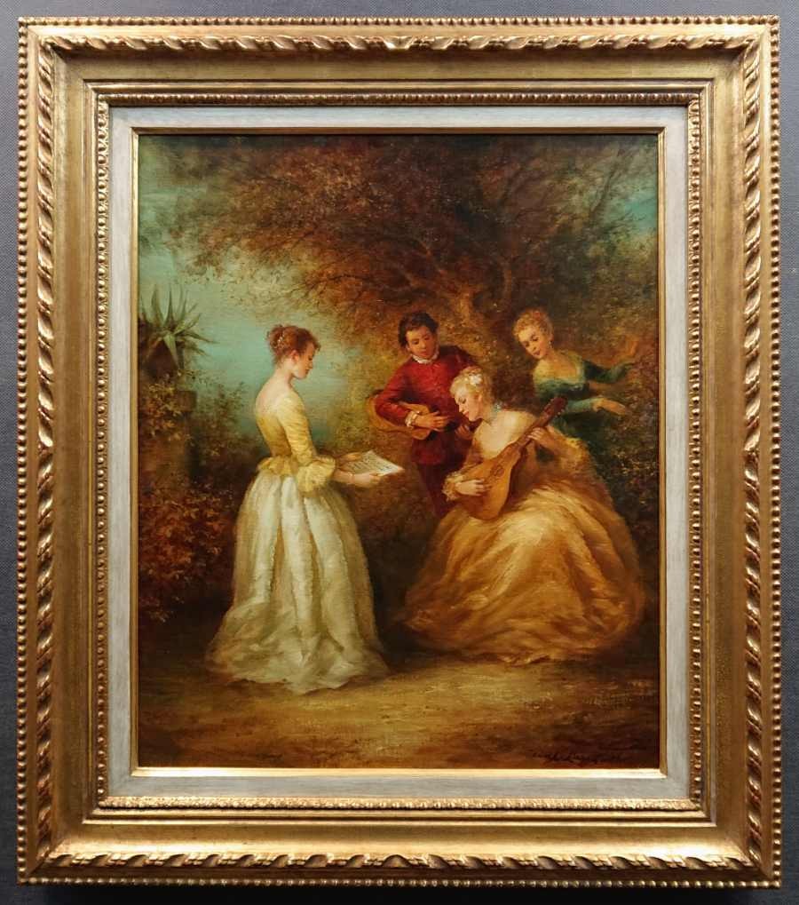 Kolorystyka obrazu jest ciepła, z dominującymi odcieniami złota, beżu i zieleni, co harmonizuje z atmosferą spokojnego, arystokratycznego życia. Rama obrazu jest w kolorze złota bogato zdobiona, w stylu klasycznym, co dodatkowo podkreśla szlachetny charakter dzieła. Obraz odzwierciedla klimat minionych epok, ukazując moment wspólnego muzykowania i towarzyskiego spotkania w pięknym otoczeniu natury.