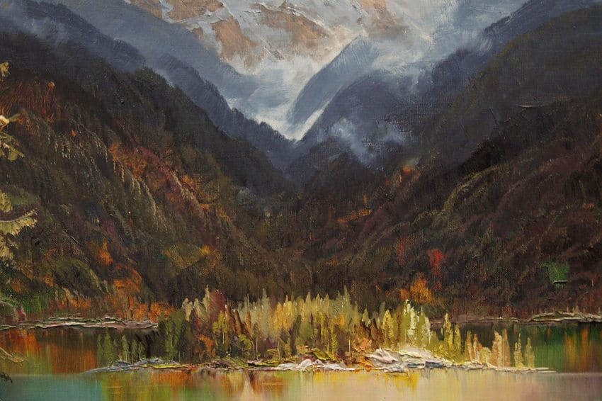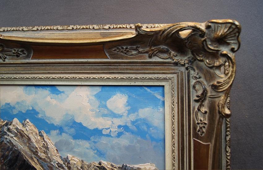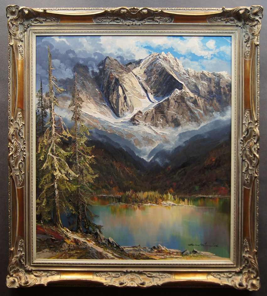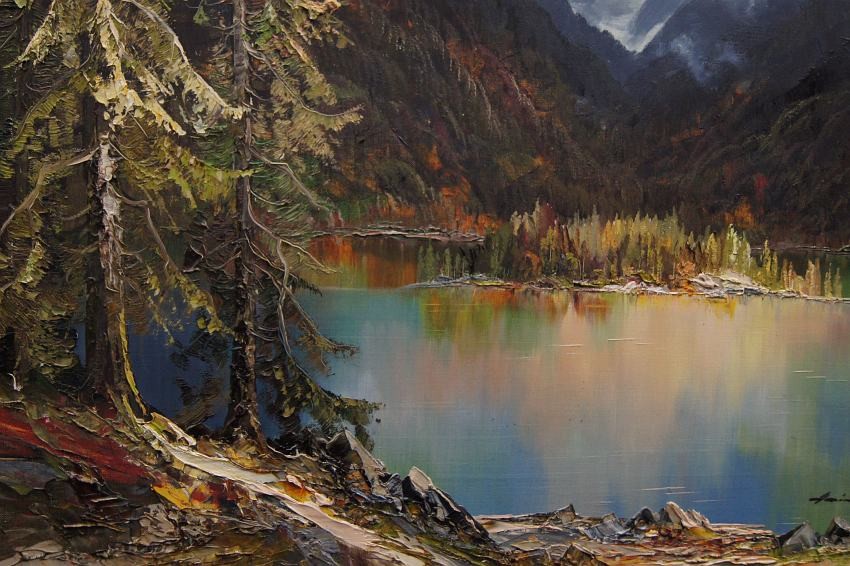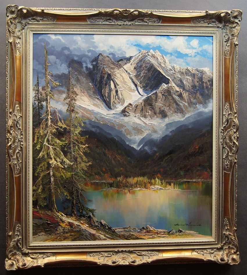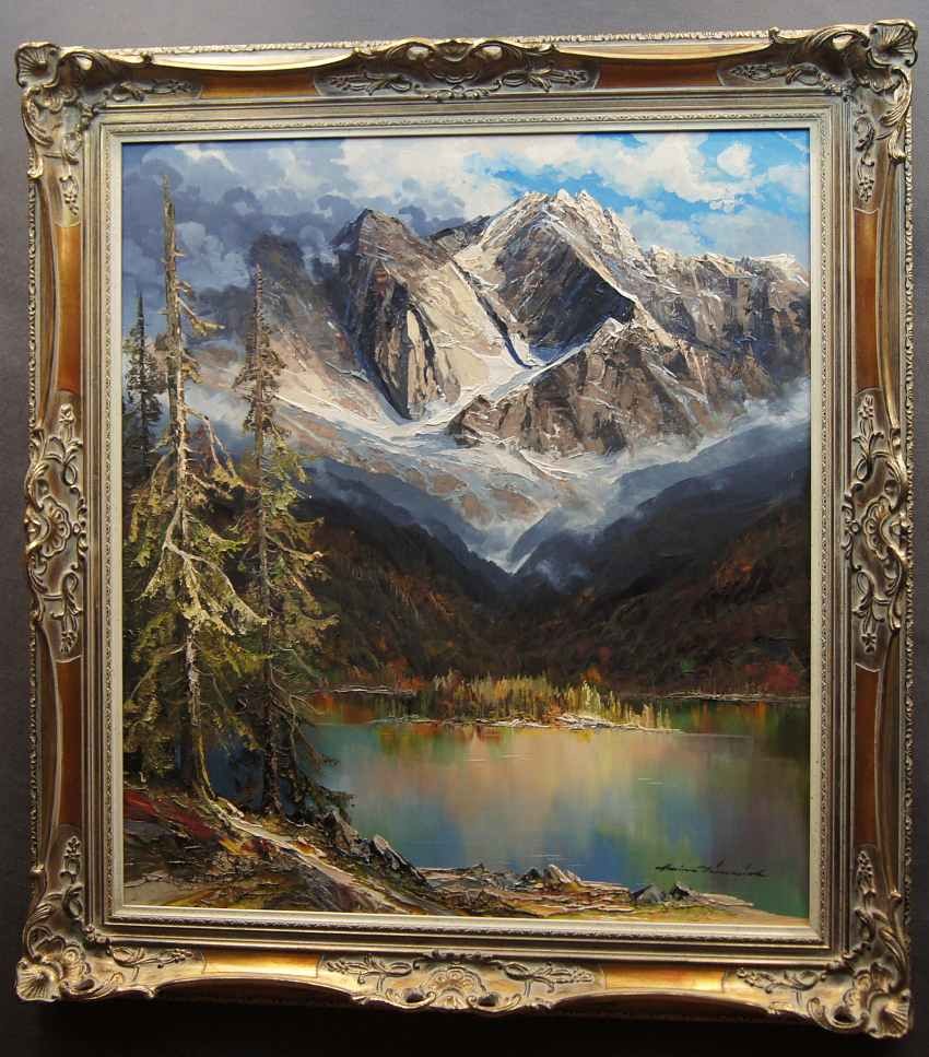 Oryginalny, niezwykle dekoracyjny, wysokiej klasy obraz olejny z pejzażem górskim. Praca niemieckiego cenionego, aukcyjnego artysty o niezwykłych walorach artystycznych. Malarz z niebywałym polotem uwiecznił wizerunek jeziora Eibsee u podnóża szczytu Zugspitze. Obraz malowany śmiałymi pociągnięciami w technice pędzla i szpachli. Wspaniała, odważna i bogata gama kolorów.