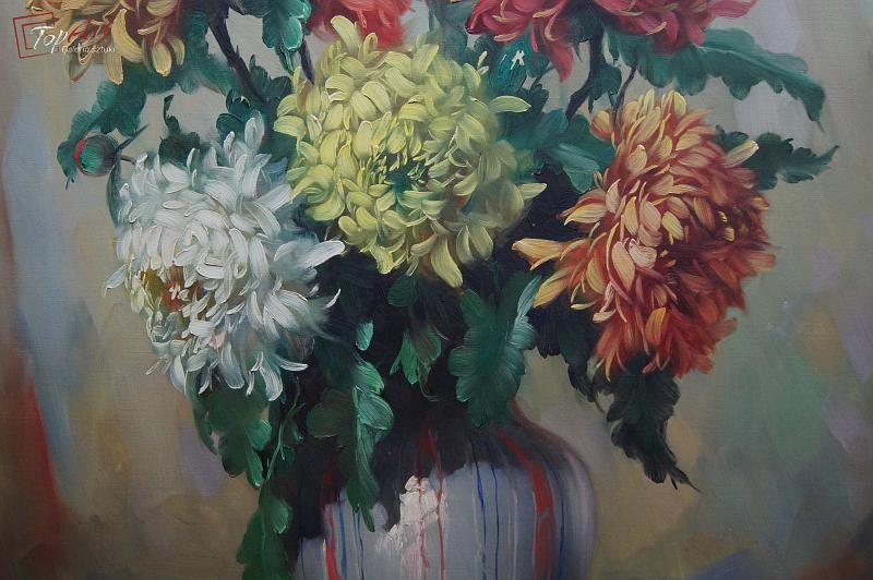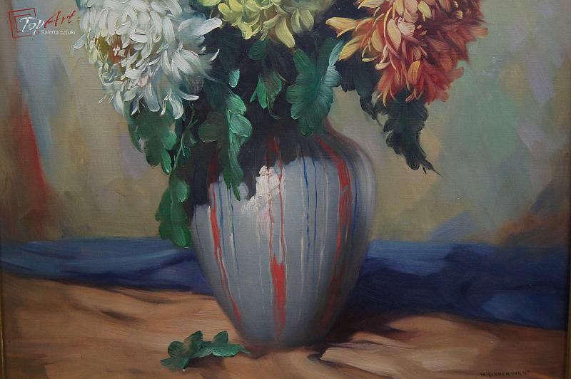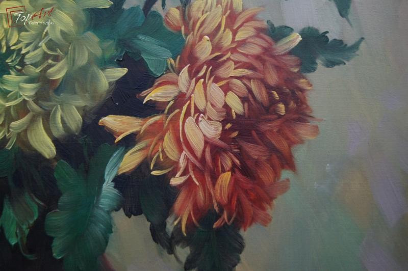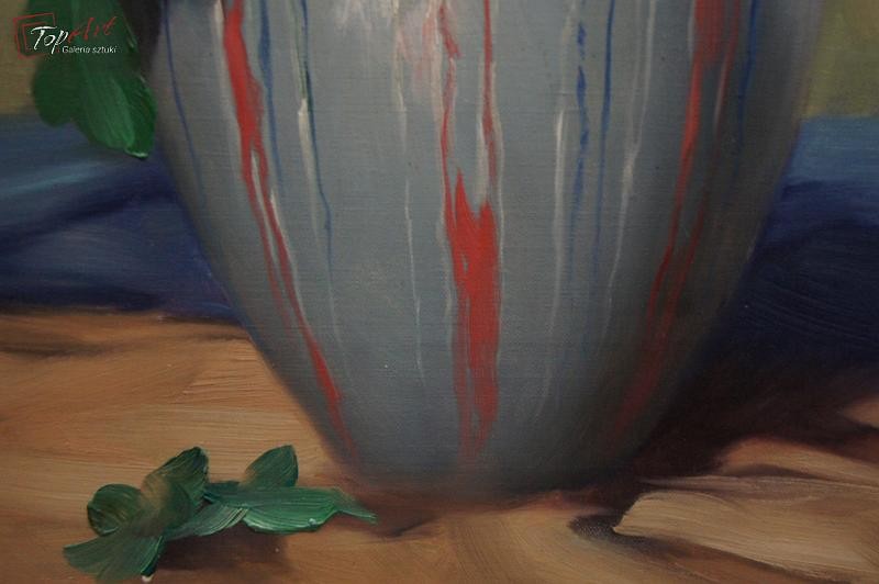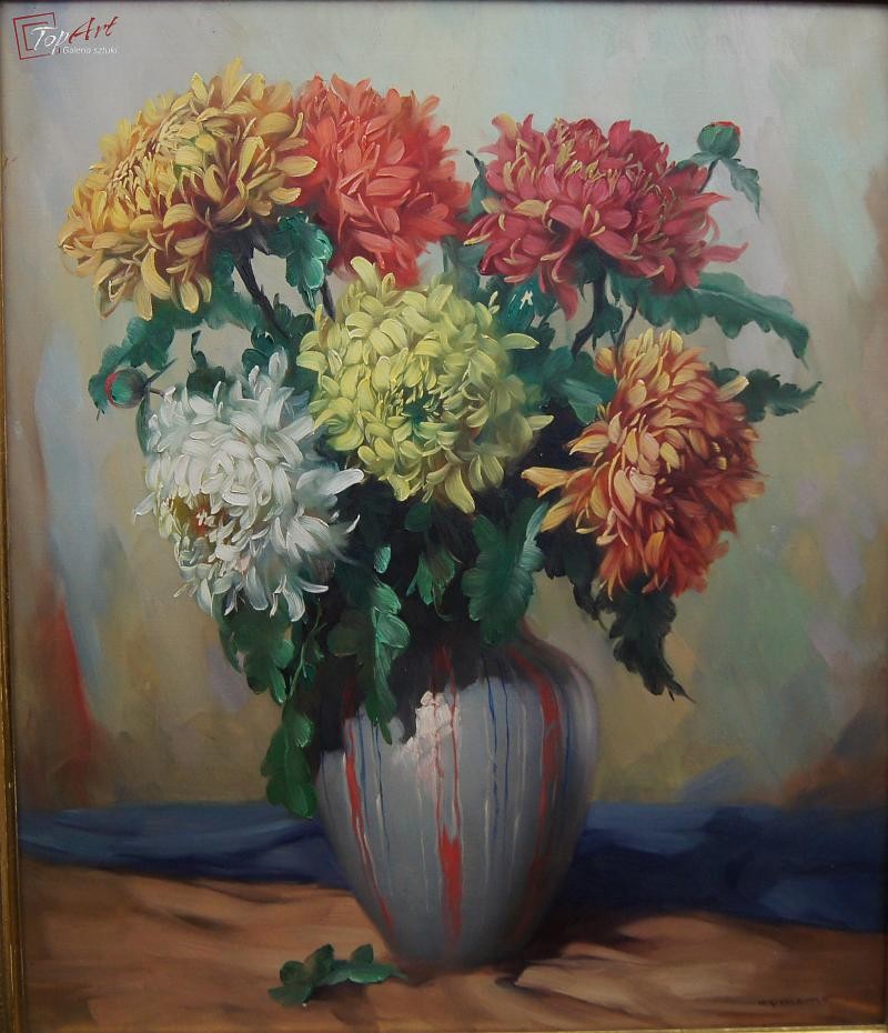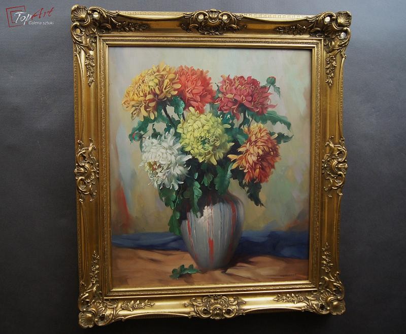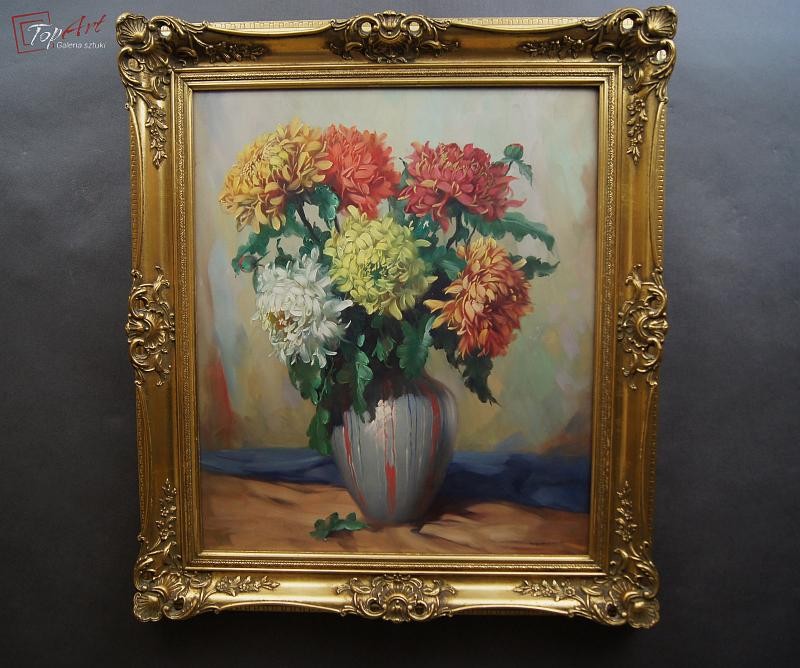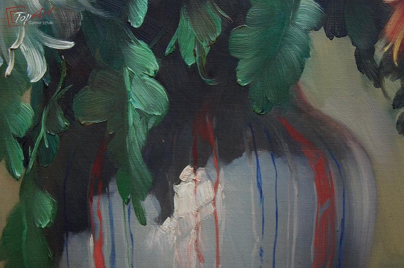 Niezwykle barwny, odzwierciedlający szczegóły, oryginalny obraz namalowany na płótnie. Przedstawiający martwą naturę - kwiaty w wazonie, Autorem tej pracy jest Helmuth Andreas Volkwein. Obraz malowany w technice pędzla. Nałożona farba jest wyczuwalna pod palcami. Sygnowany prawy dól H.A. Volkwein. Całość oprawiona w oryginalną przestrzenną ramę. Obrazy artysty cieszą się dużym powodzeniem i są pożądane na aukcjach sztuki.