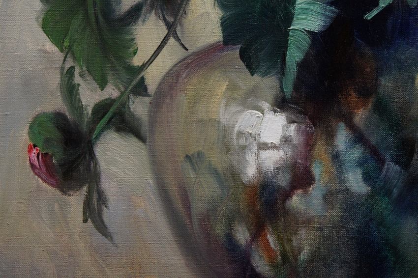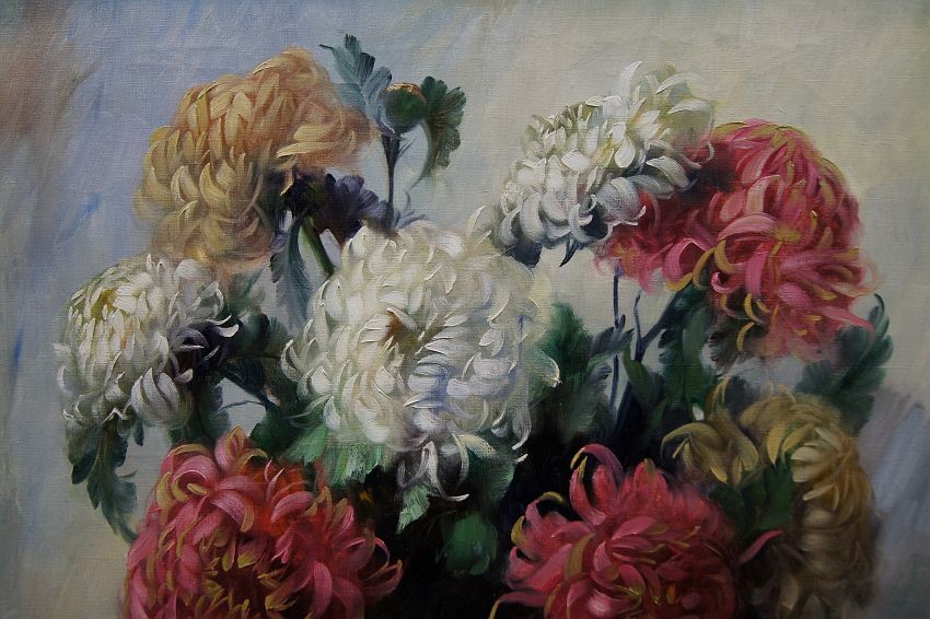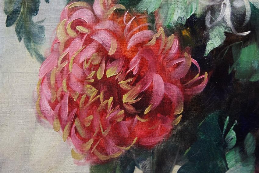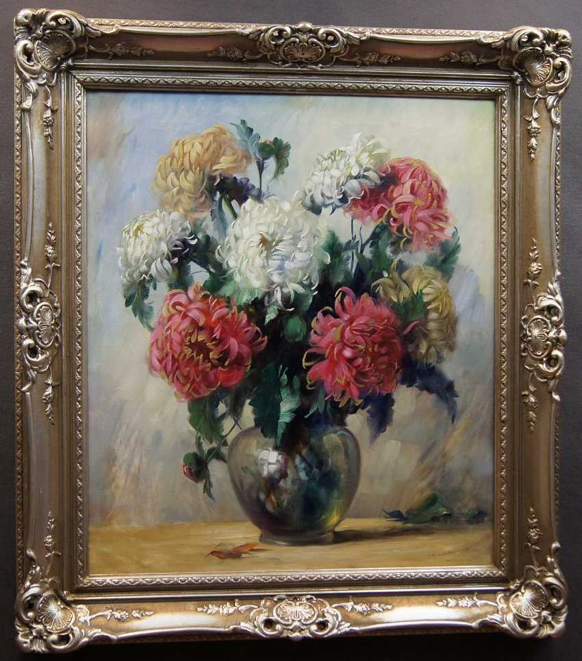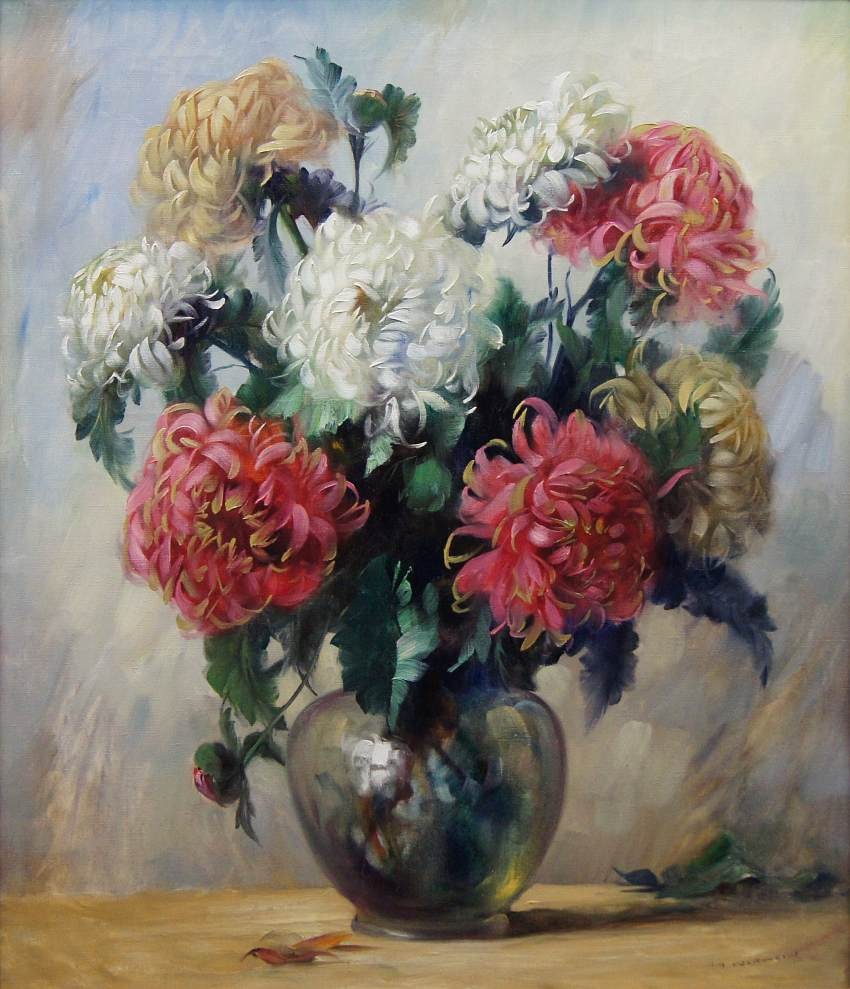 Oferujemy jeden z lepszych obrazów tego artysty malującego przeważnie martwe natury. Barwny, stary obraz, o kompaktowych wymiarach. Posiadający bardzo duże walory artystyczne i dekoracyjne. Przedstawia bukiet różnokolorowych chryzantem w wazonie. Namalowany perfekcyjnie śmiałymi pociągnięciami pędzla na płótnie malarskim naciągniętym na krosno.