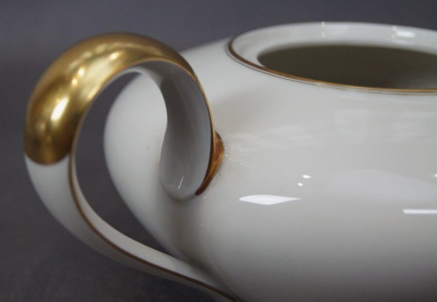 Wykonany z najwyższej jakości porcelany, w formie dzbanka z serwisu. Wykonany w renomowanej niemieckiej wytwórni porcelany, w pięknym odcieniu koloru ecru. Udekorowany imponującymi złoceniami. Niezwykle piękny dekoracyjny przedmiot do kolekcji lub codziennego użytku.