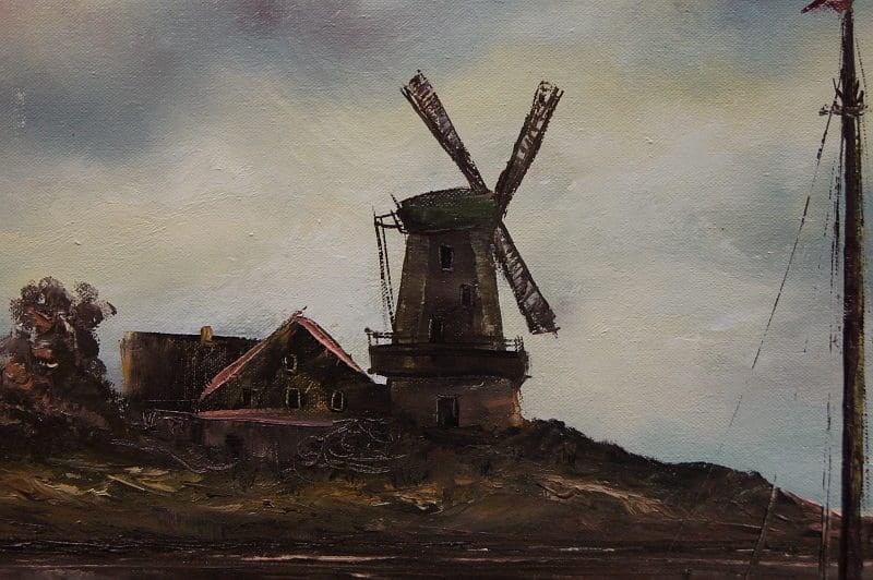 Dekoracyjny obraz olejny przedstawiający uroczy pejzaż z łodzią i wiatrakiem w tle. Praca malowana farbami olejnymi na płótnie w technice pędzla. Wspaniała ciepła kolorystyka, oraz przepiękne światło tworzą ciepły klimat obrazu.