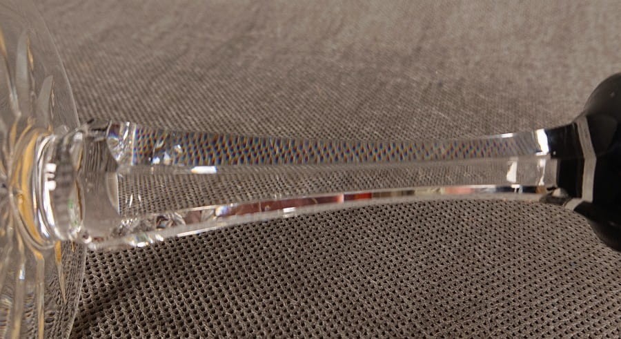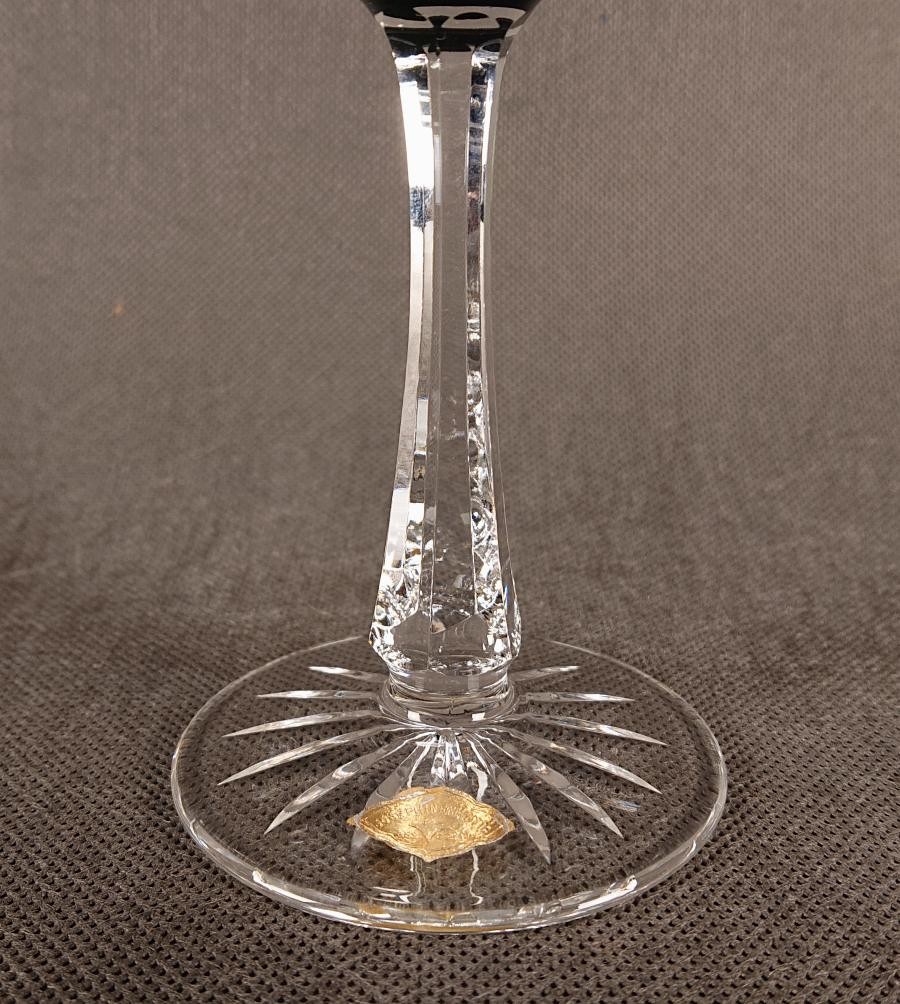 Noga kielicha jest długa, smukła i wykonana z bezbarwnego, przejrzystego szkła kryształowego. Posiada bardzo charakterystyczne, precyzyjne szlifowania, które nadają jej rzeźbiarski charakter. W górnej części, tuż pod czaszą, znajduje się wyraźne, fasetowane zgrubienie o geometrycznych krawędziach. Niżej, trzon jest zdobiony pionowymi, drobnymi szlifowaniami, które przypominają wąskie, ząbkowane listewki lub paski. Ten specyficzny wzór nogi z drobnymi, ząbkowanymi krawędziami jest sygnaturą Josephinenhütte i często pojawia się w ich wyrobach z tego okresu.