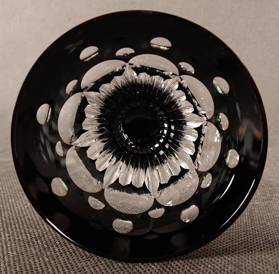 Czasza kielicha jest pękata i zaokrąglona, zwężająca się lekko ku górze. Jej rubinowa powierzchnia jest bogato i precyzyjnie szlifowana. Szlify są głębokie i wyraźne, przechodzące przez rubinową warstwę, co odsłania bezbarwne szkło pod spodem, tworząc lśniące, geometryczne wzory, które efektownie załamują i odbijają światło. Wzory obejmują: