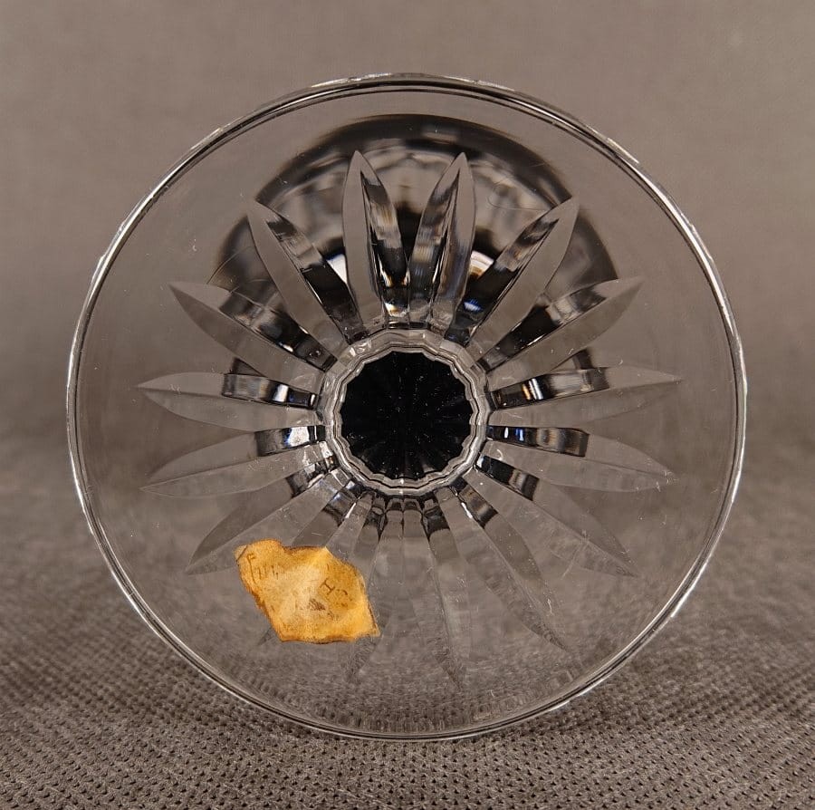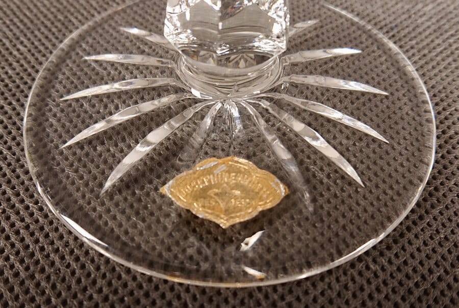 Oryginalna firmowa nalepka: Na stopie kielicha, widoczna jest oryginalna, papierowa nalepka firmowa Josephinenhütte, potwierdzająca autentyczność i pochodzenie wyrobu. Tego typu nalepki były standardowym sposobem sygnowania wyrobów luksusowych.