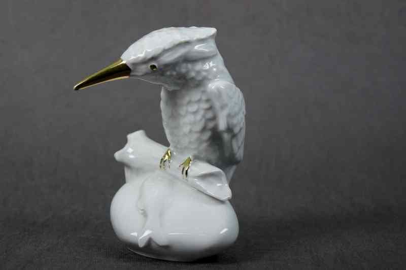 Ciekawa oryginalna figura przedstawiająca zimorodka z rybą. Zaprojektowana i wykonana w latach 70 XX wieku. Wykonana z porcelany. Glazurowana, profesjonalnie wymodelowana. Stan zachowania bardzo dobry ( bez jakichkolwiek pęknięć i wyszczerbień ). Wymiary: wysokość 13 cm, podstawa 11 cm x 6 cm.