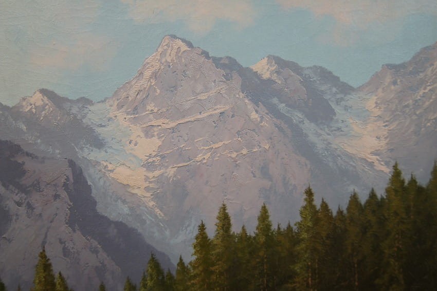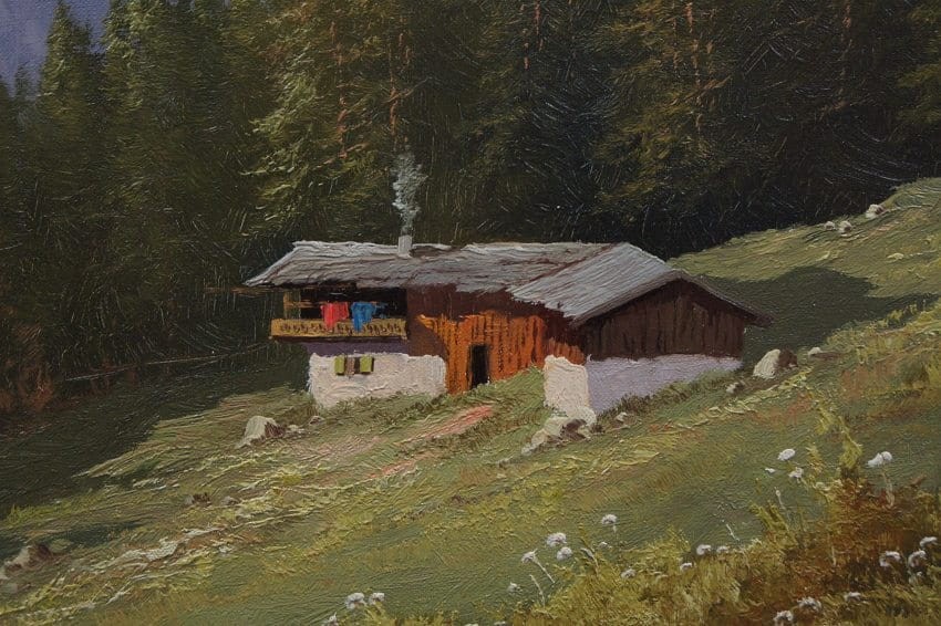 Przedstawiona praca to kolejna fantastyczna perełka w ofercie naszej galerii. Jest to oryginalny obraz malowany na płótnie z lat 50 - 60.XX wieku. Prezentowana pozycja charakteryzuje się dużymi walorami estetycznymi i dekoracyjnymi. Malarz na obrazie przedstawia alpejski pejzaż górski z samotnią na pierwszy planie. Obraz malowany śmiałymi pociągnięciami pędzla świadczącymi o dużym kunszcie malarski. Malowidło stworzone w niezmiernie naturalnej kolorystyce i przyjaznych dla oka odcieniach.