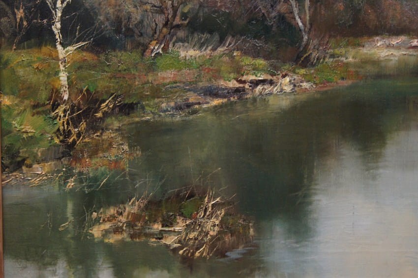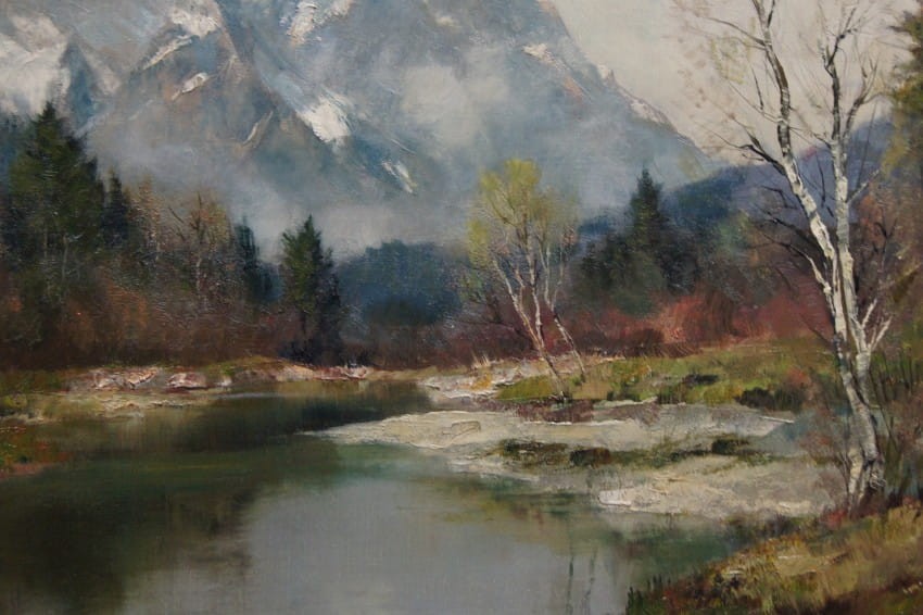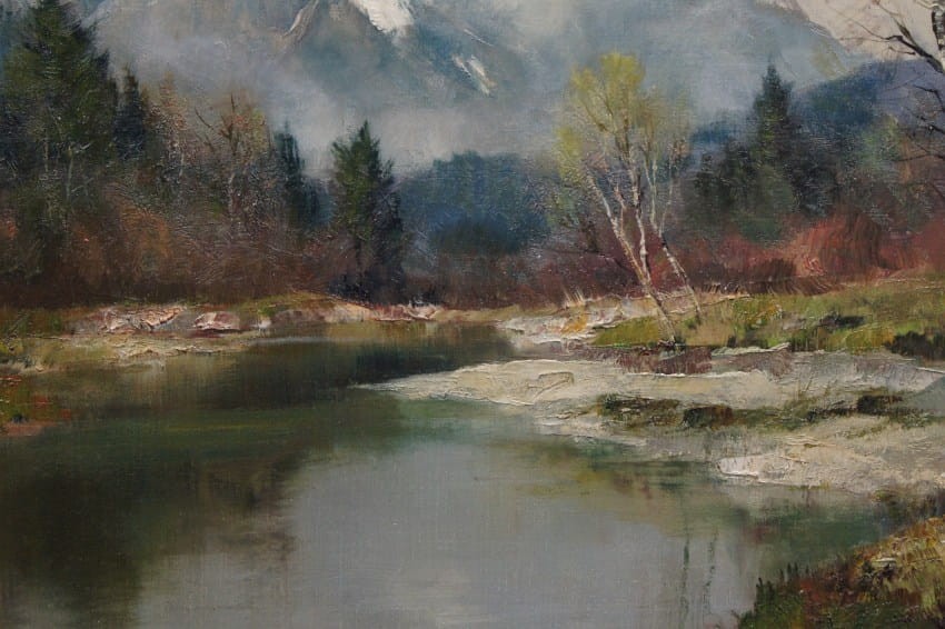 O ARTYŚCIE: Josef Burger urodzony w Monachium w 1887 roku, zmarły 1966, również w Monachium. Niemiecki malarz, nauki pobierał w pracowni Leo Putza, a następnie rozpoczął pracę jako konserwator zabytków. Tworzył głównie pejzaże i martwe natury. Jego prace tworzone techniką olejną posiadają cechy malarstwa akademickiego. Najczęstszym tematem pejzaży Josefa Burgera były widoki małych miasteczek, wsi lub gór, na pierwszym planie artysta umieszczał motyw rzeki, stawu, jeziora. Całe życie zawodowe związał z Monachium, jego prace charakteryzuje używanie przez artystę wysokiej jakości materiałów. Prace Josefa Burgera znajdują się w zbiorach muzeum sztuki w Monachium.