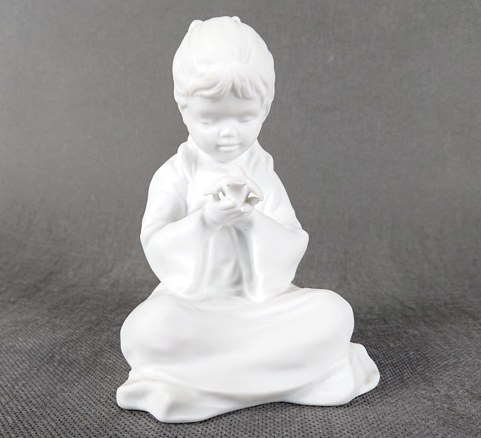Przedstawiamy Państwu niezwykle subtelną i pełną wdzięku figurkę kolekcjonerską z renomowanej niemieckiej manufaktury Kaiser. To urokliwe przedstawienie dziecka z ptaszkiem jest kwintesencją niewinności i spokoju, ujętą w szlachetnej, białej porcelanie.