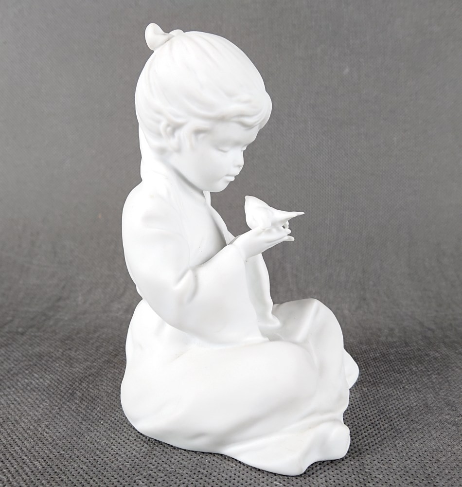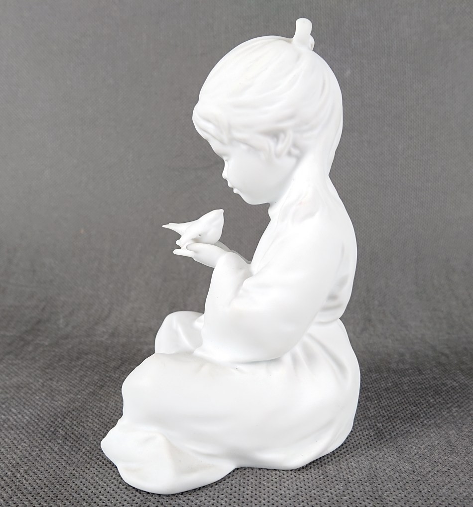 Figurka została wykonana z wysokiej klasy porcelany biskwitowej, która dzięki swojej matowej teksturze doskonale wydobywa najdrobniejsze detale rzeźbiarskie. Brak szkliwienia pozwala w pełni docenić kunszt modelarza – od miękkich fałd dziecięcego ubranka, przez delikatną strukturę włosów, aż po maleńką sylwetkę ptaszka spoczywającego w dłoniach dziewczynki. Biel biszkwitu nadaje obiektowi czystości i nowoczesnej elegancji, sprawiając, że rzeźba niemal "świeci" własnym, wewnętrznym światłem.